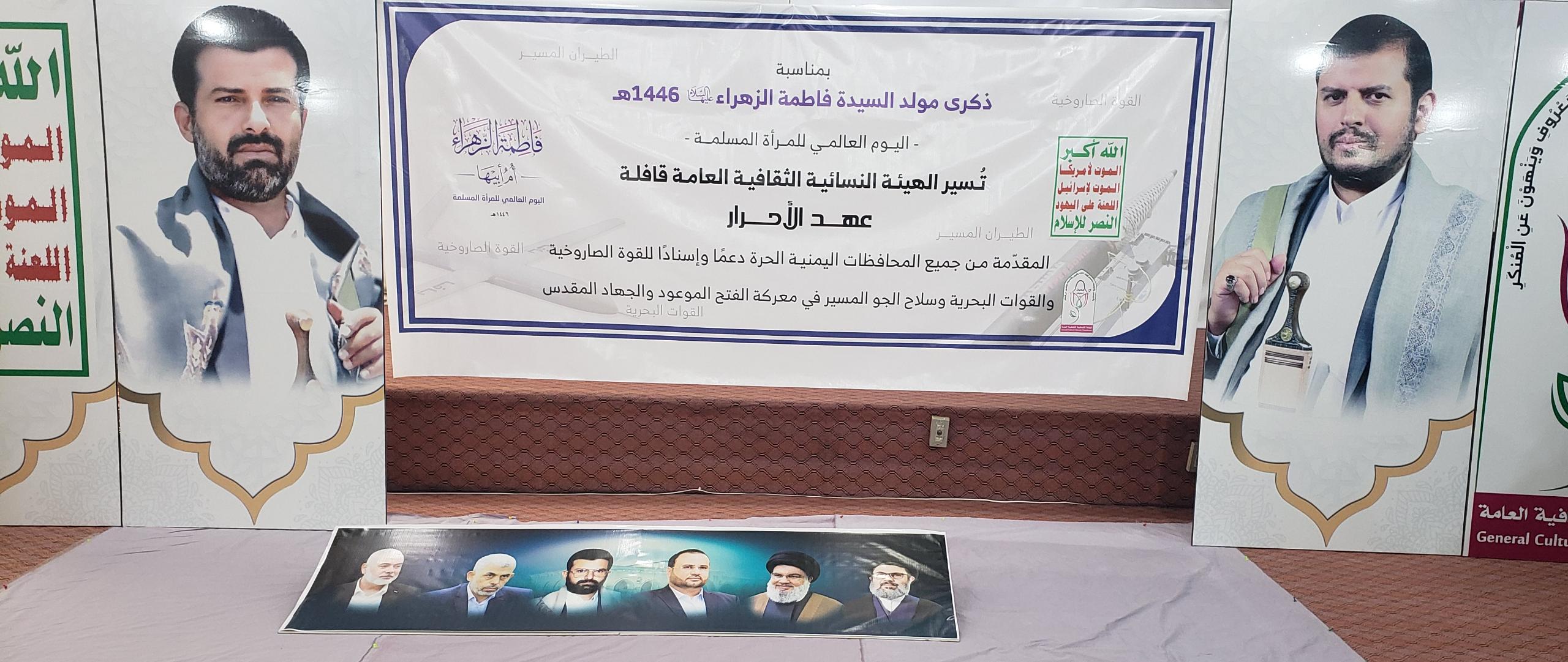 وأقمن 40.640 نشاطًا تعبويًا وثقافيًا على مستوى المناسبات الاجتماعية، والبرامج الثقافية، بحسب إحصاءات المركز الإعلامي للهيئة النسائية الثقافية العامة لحركة أنصار الله. ونظّمن خلال أسبوع المناسبة 450 وقفة نفير وغضب إسنادًا لغزة ولبنان وسورية، ترافقت معها فعاليات ثقافية حملت شعار "زهراء العصر في درب النصر".