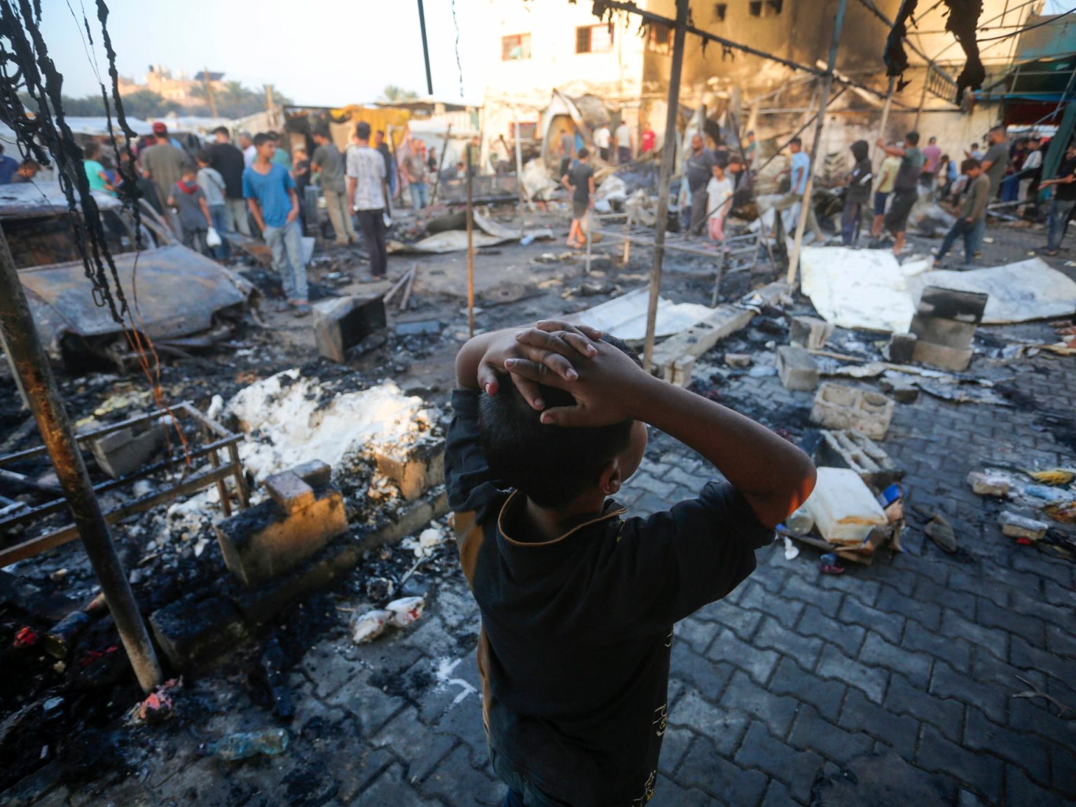 ويتابع السيد القائد قائلا:" العدو يلقي القنابل الأمريكية المدمِّرة ويلقيها على النازحين، بعد أن تحوَّل معظم سكان قطاع غَزَّة إلى نازحين، يلقي عليهم القنابل الأمريكية المدمِّرة والحارقة إلى خيامهم؛ فيحرقهم، ويقتلهم، ويمزِّق الأطفال إلى أشلاء، والبعض إلى جثامين متفحمة، في داخل تلك الخيام".