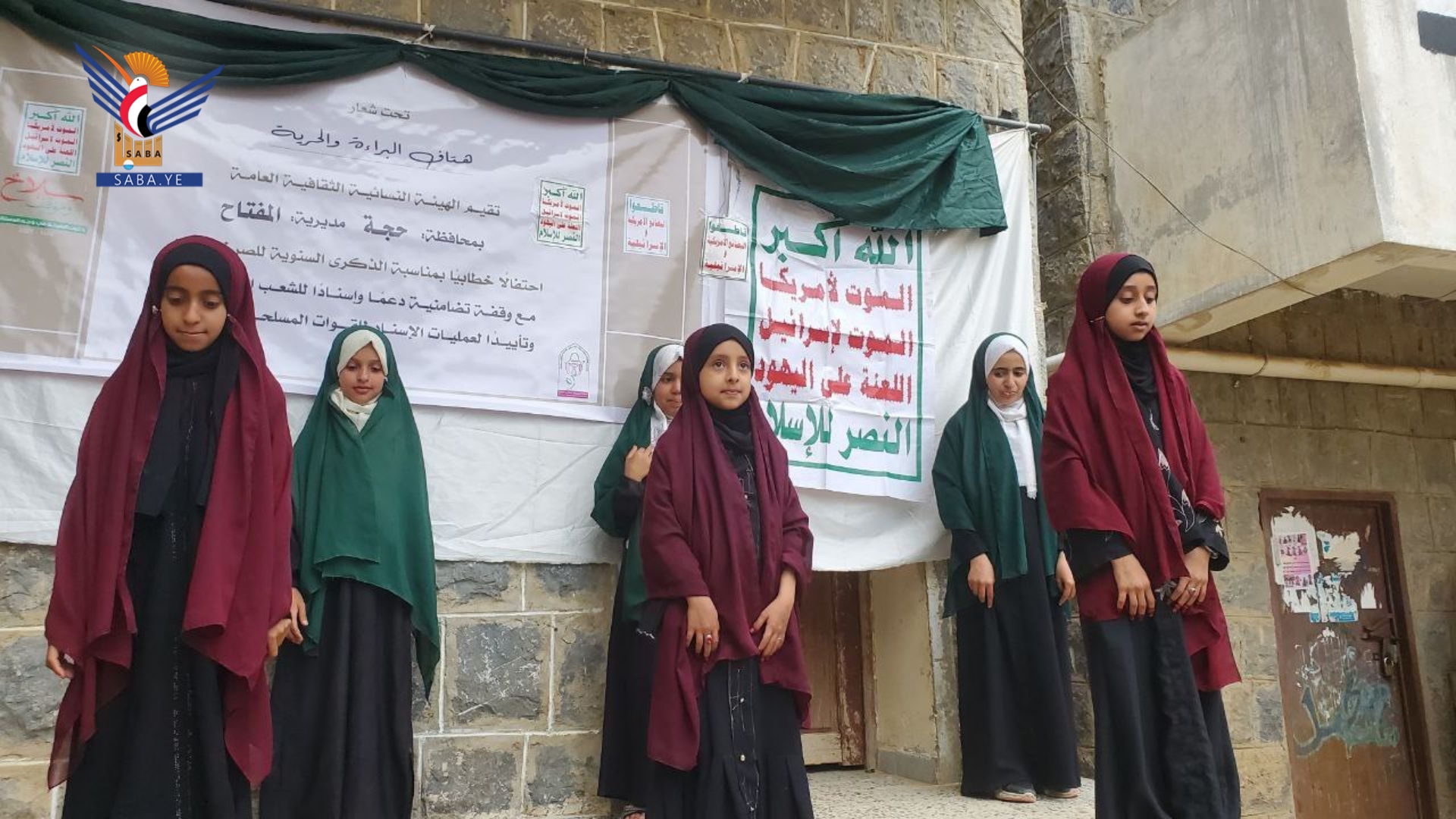 نظمت الهيئة النسائية الثقافية بمحافظة حجة اليوم فعاليات ثقافية بالذكرى السنوية للصرخة في وجه المستكبرين ووقفات تضامنية مع الشعب الفلسطيني في غزة.