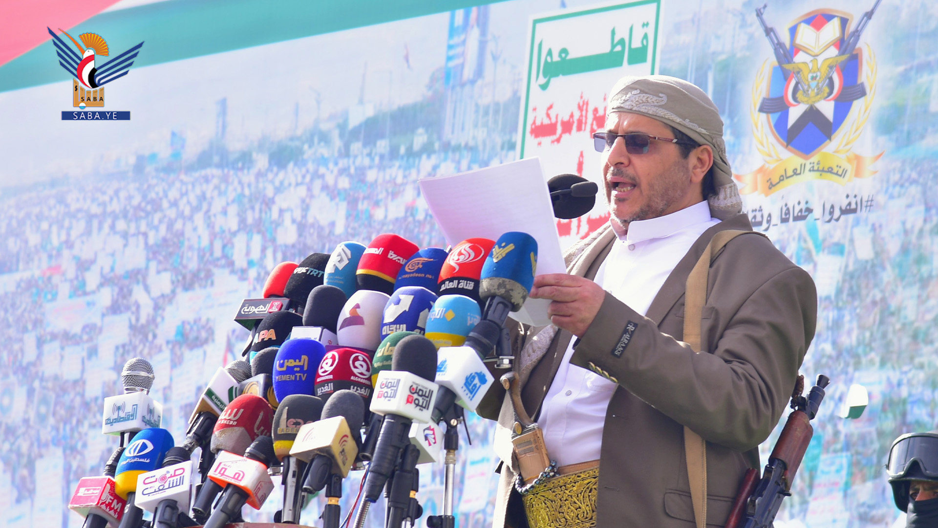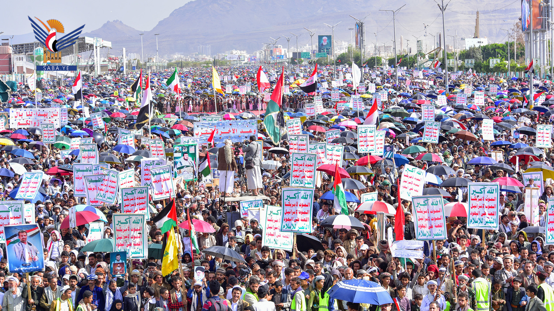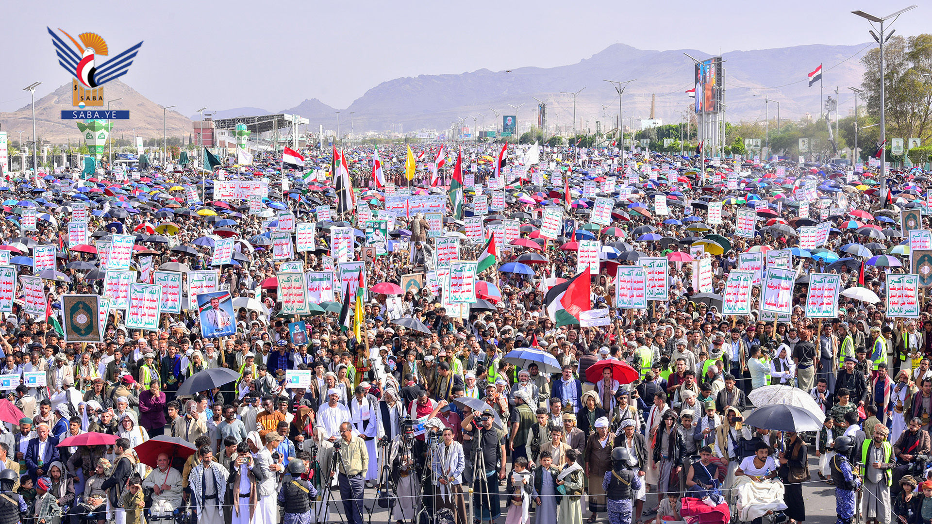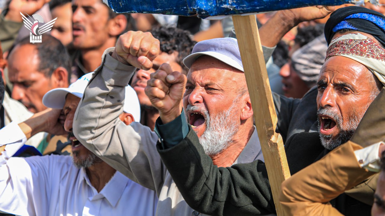ورددت الجماهير (يا عالم يكفيك سكوت.. غزة بالتجويع تموت)، (أين دعاة الإنسانية.. من إجرام الصهيونية)، (أمريكا جاءت لتساعد.. فابتكرت للموت مصائد)، (غزة تفخيخ وكمائن.. لن تترك محتلاً آمن)، (في غزة لله رجال.. معجزة في الاستبسال)، (مع غزة موقف متكامل.. دعم تصعيد متواصل)، (يا غزة واحنا معكم.. أنتم لستم وحدكم)، و(فوضناك يا قائدنا فوضناك.. أيدناك أيدناك.. واحنا سلاحك في يمنك).