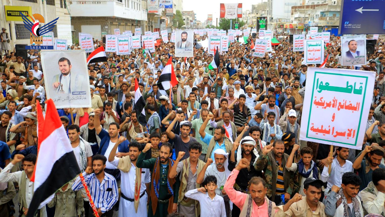 وجدد بيان صادر عن المسيرات، تمسك الشعب اليمني بموقفه الثابت والفاعل تجاه القضية الفلسطينية، ورفضه التام لأي تراجع أو تخاذل في مناصرة الشعب الفلسطيني المظلوم، لا سيما في ظل المجازر والمجاعة التي يتعرض لها أهالي غزة نتيجة العدوان الصهيوني المدعوم أمريكياً وغربياً.