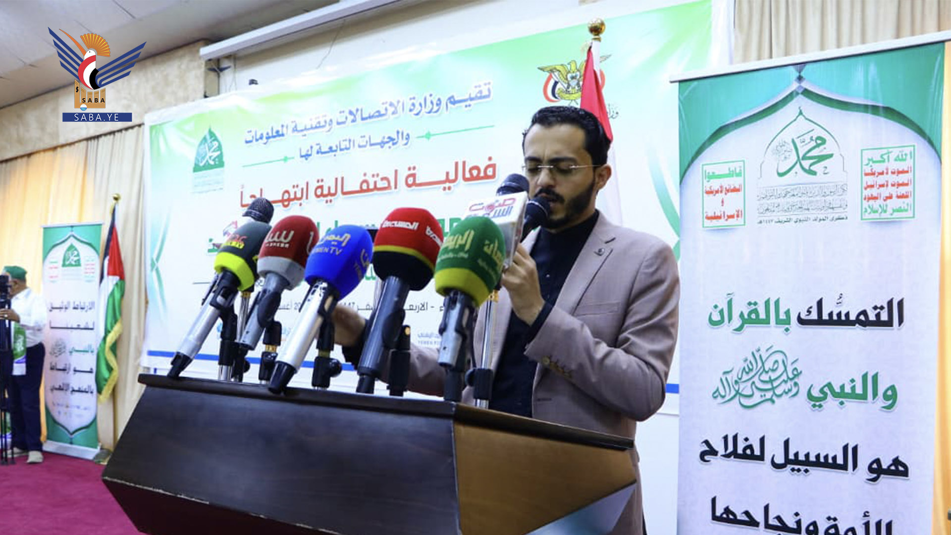 وأوضح نائب وزير الاتصالات وتقنية المعلومات المهندس علي المكني أن قطاع الاتصالات يشارك الشعب اليمني الاحتفالات المميزة بذكرى مولد رسول الرحمة والإنسانية.