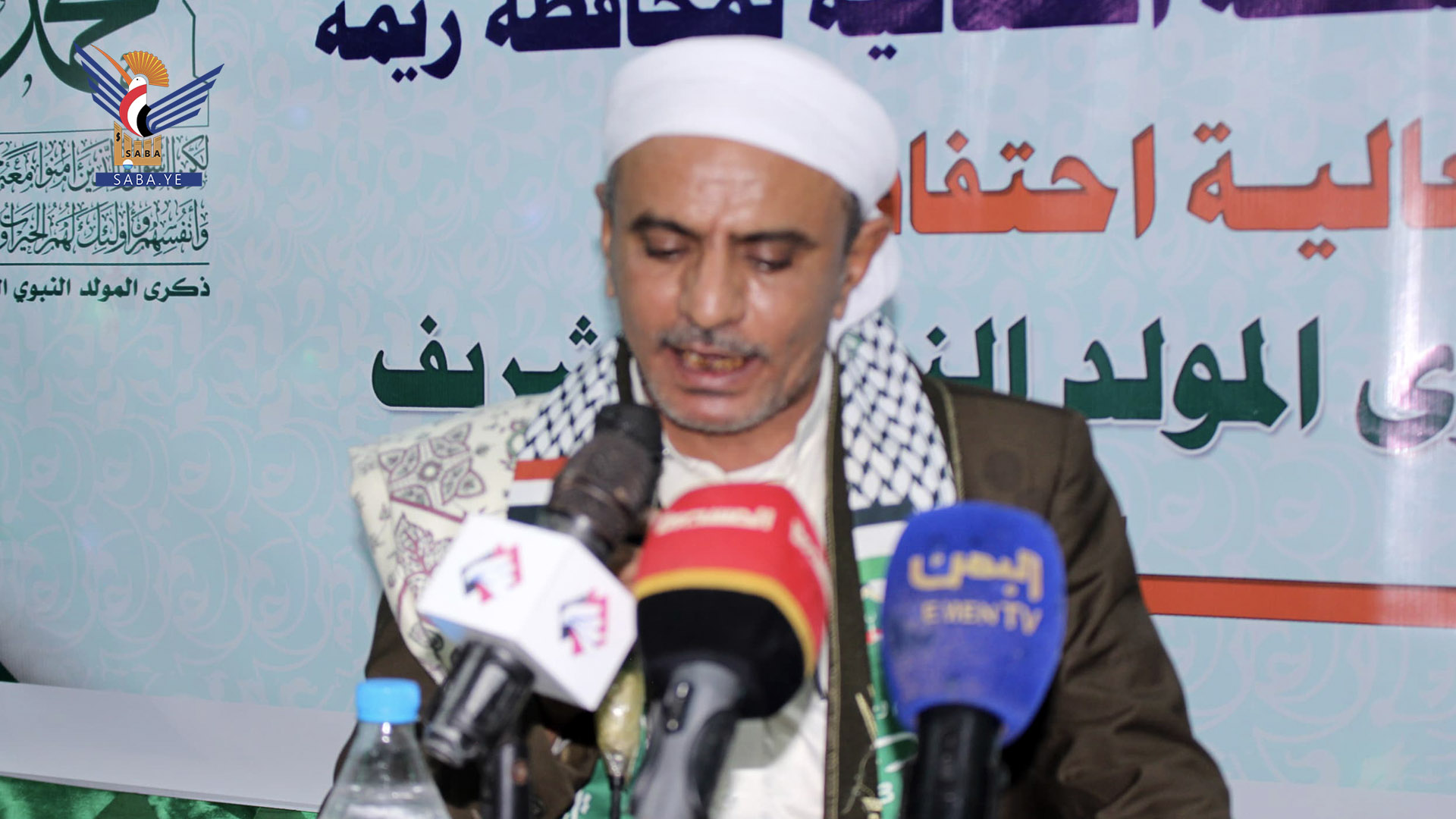 واعرب عن اعتزازه بمشاركة أبناء ريمة في الاحتفال بهذه المناسبة الدينية.. لافتاً إلى أن النبي الكريم، جسد في حياته أرقى معاني العدل والإنصاف، وسار بسلوكه ونهجه على خطى القرآن، فكان قدوة الحسنة في الصدق والأمانة، ومعلماً للبشرية في مكارم الأخلاق.