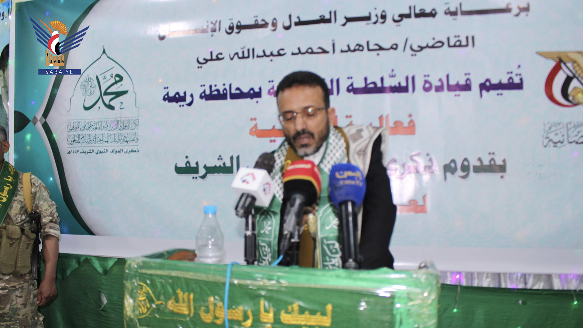 وفي الفعالية، أوضح نائب وزير العدل وحقوق الإنسان القاضي ابراهيم الشامي، أن ذكرى المولد النبوي محطة إيمانية متجددة لاستلهام معاني الدروس من سيرة الرسول الأعظم والاقتداء بجهاده وصبره في مواجهة أعداء الله والإنسانية، وتعزيز الانتصارات على المستويات الأمنية والعسكرية والقضائية والتنموية.
