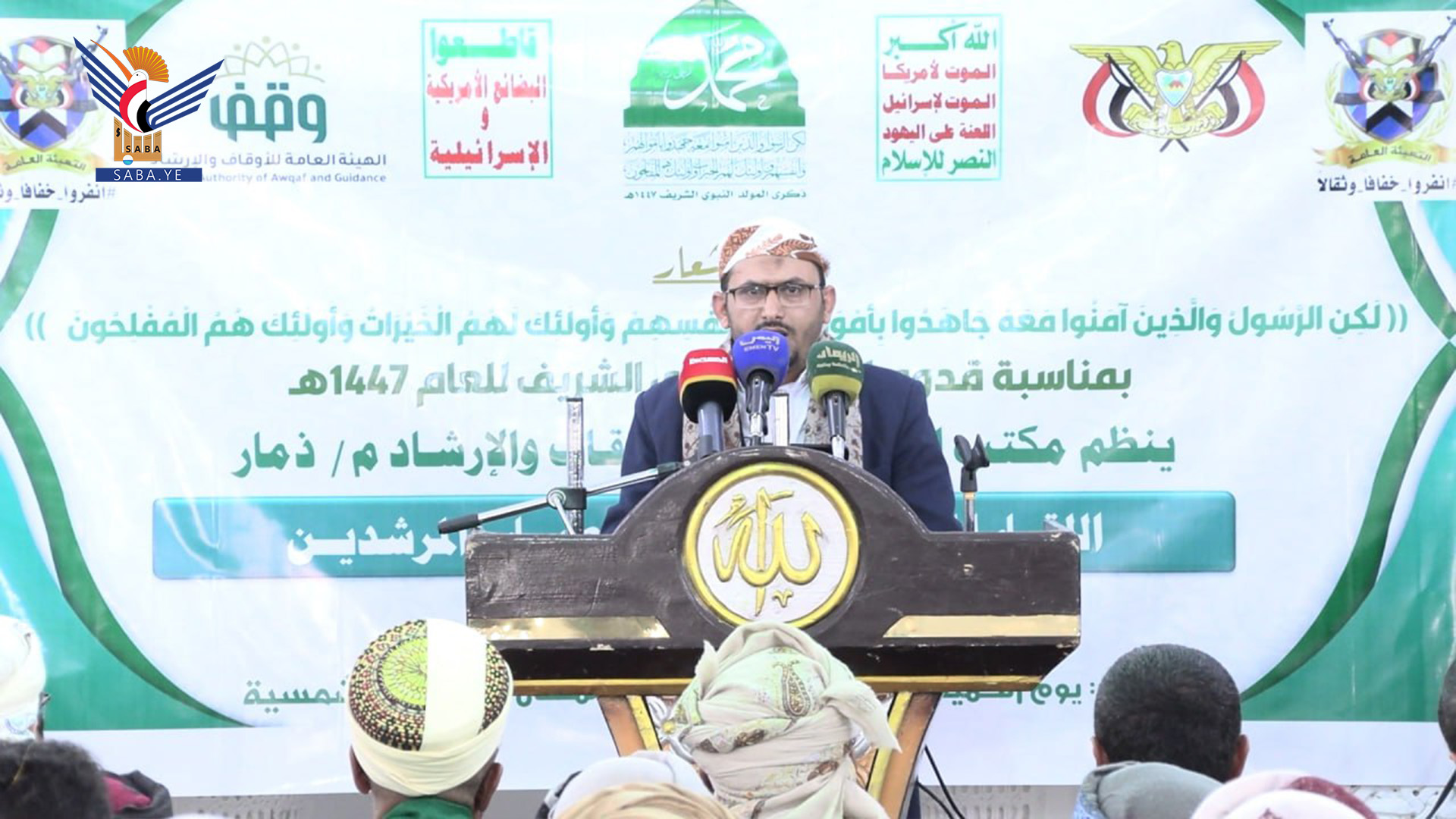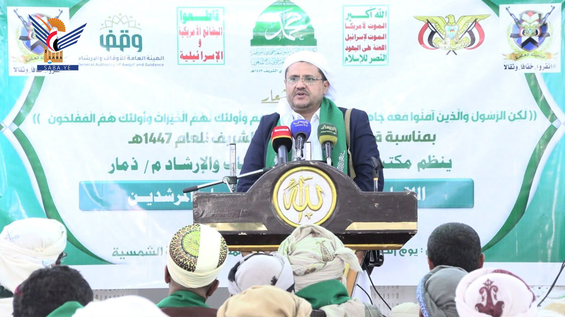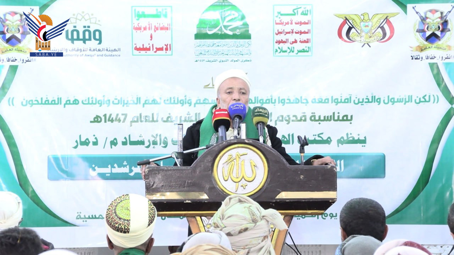 من جانبه، أكد رئيس الهيئة العامة للأوقاف والإرشاد العلامة عبدالمجيد الحوثي، أن الشعب اليمني يحمل قيم الإنسانية والدين، ويتشرف بالاحتفاء بأعظم شخصية في الكون، وفي انسجام مع القيادة والجيش في القيام بواجبه تجاه غزة.