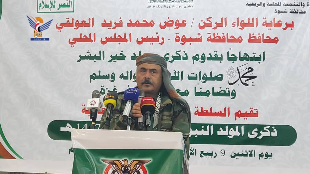 وفي الفعالية نوه محافظ شبوه الركن عوض العولقي بمشاركة مشايخ ووجهاء ومسؤولي المحافظة في إحياء ذكرى المولد النبوي، لافتًا إلى أن فعالية المولد تجسّد شخصية أعظم وأكبر وأفضل قائد في تأريخ البشرية.