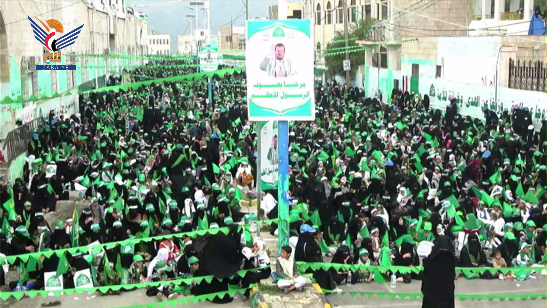 ورددت المشاركات هتافات الولاء والانتماء للرسول الأعظم صلى الله عليه وآله وسلم.. رافعات اللافتات المعبّرة عن الفرحة والابتهاج بذكرى مولد خاتم الأنبياء والسراج المنير محمد صلى الله عليه وآله وسلم.