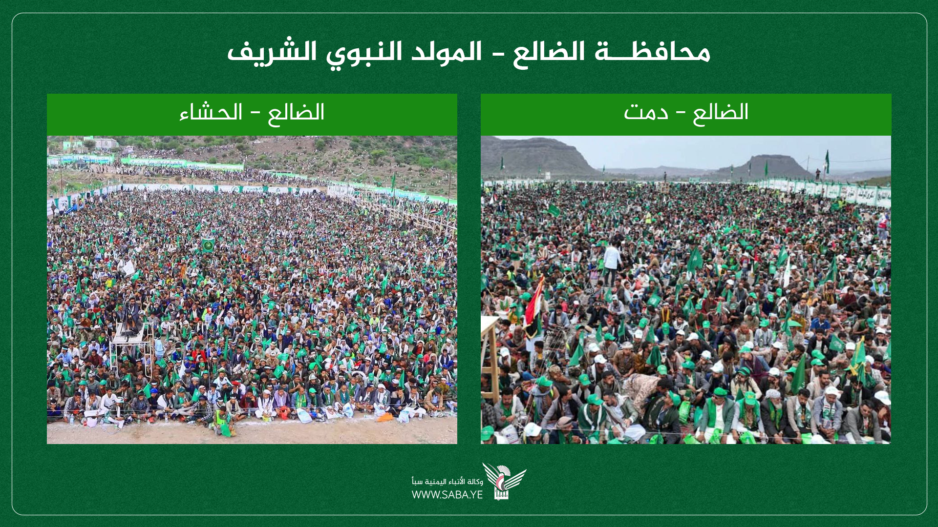 شهدت محافظة الضالع في الثاني عشر من ربيع الأول توافد حشود جماهيرية غير مسبوقة من مختلف القرى والعزل بمديريات المحافظة إلى ساحتي الاحتفال المركزي بذكرى المولد النبوي الشريف في مديريتي دمت والحشاء.