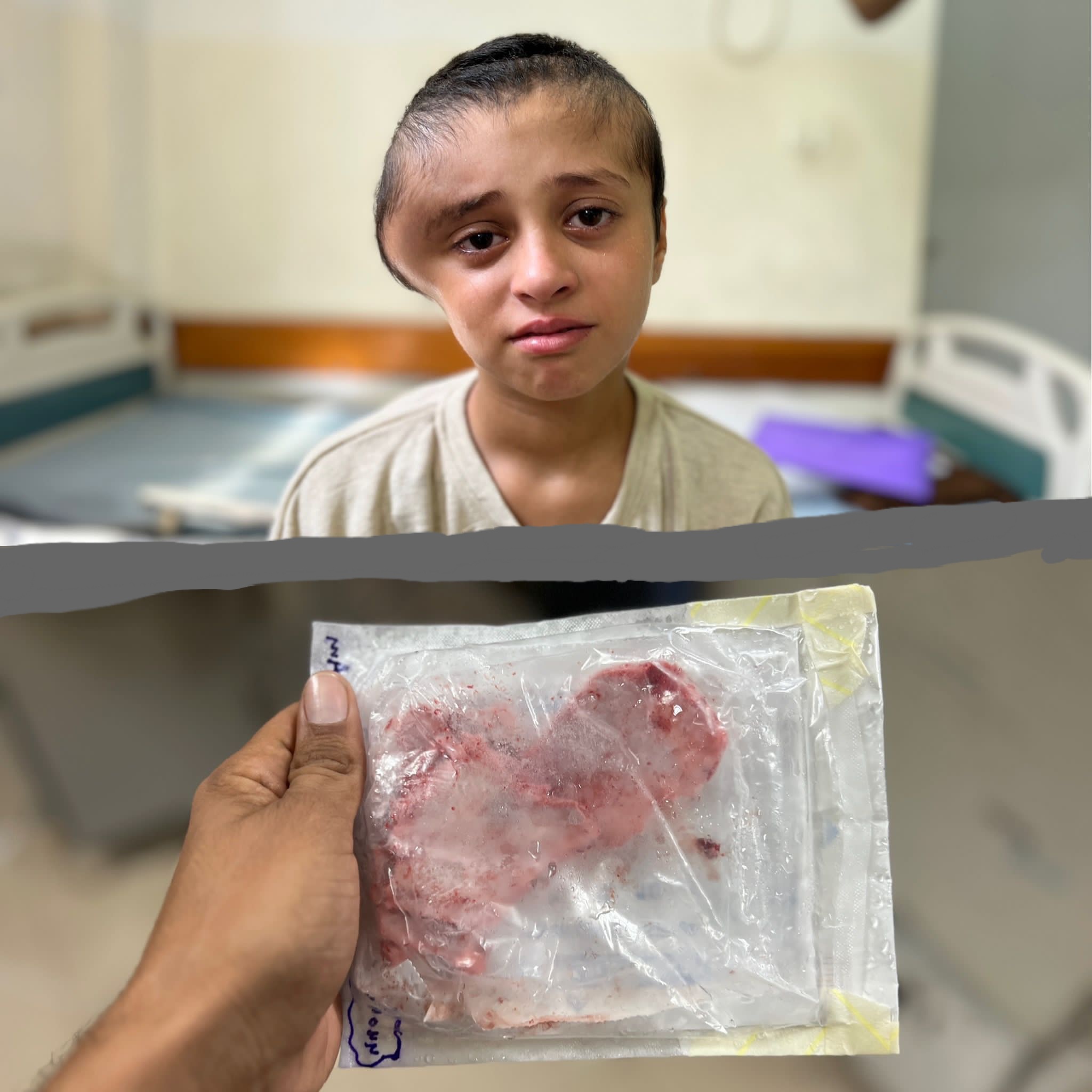 خضعت الطفلة لعملية جراحية دقيقة استمرت ساعات طويلة، انتهت بإزالة الجزء الأمامي من جمجمتها لإيقاف النزيف وإنقاذ حياتها. ومنذ ذلك اليوم، تحفظ ثلاجة المستشفى قطعة من رأسها، بانتظار أن يُسمح لها بالسفر لإعادة زراعتها.