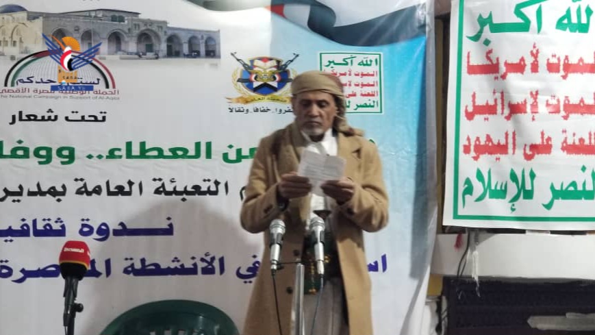 نظّمت التعبئة العامة بمديرية الثورة في أمانة العاصمة اليوم، ندوة ثقافية بعنوان "عامان من العطاء، ووفاءً لدماء الشهداء" استمرارا في الأنشطة المناصرة للشعب الفلسطيني.