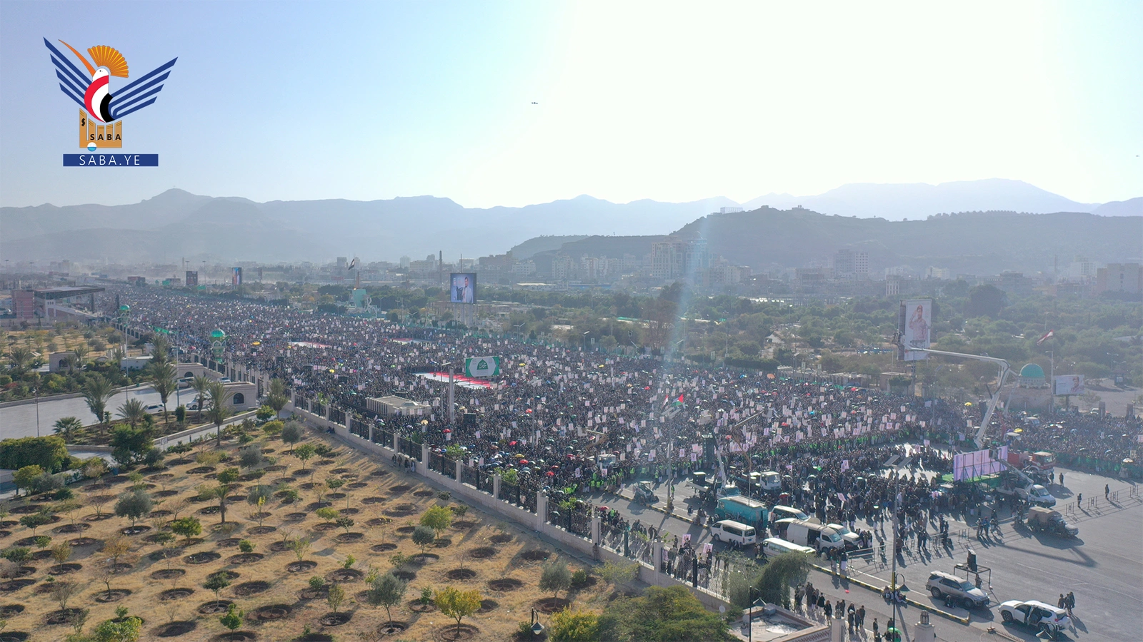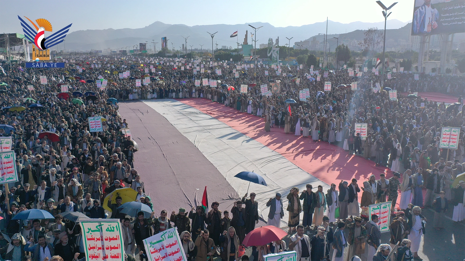 ورددت الحشود في المسيرة الكبرى بميدان السبعين، شعار البراءة من أعداء الله والخونة والعملاء، وهتافات الحرية والاستقلال والاستنفار والجاهزية للتصدي للمحتلين الجدد وتحرير كامل تراب الوطن من الغزاة المجرمين.