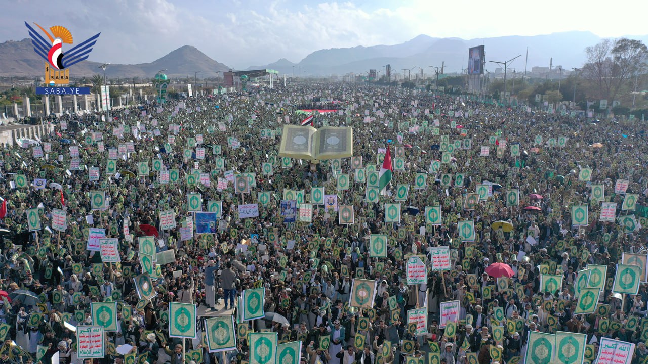 طوفان بشري غاضب بالعاصمة صنعاء في مسيرة "نفير واستنفار.. نصرة للقرآن وفلسطين"