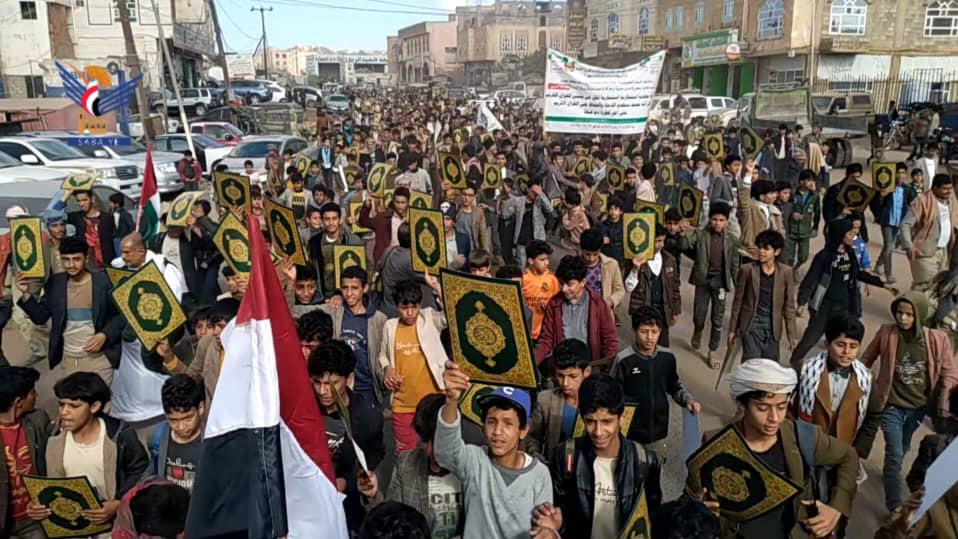 ورددّ المشاركون في المسيرة، هتافات معبّرة عن التمسك بكتاب الله، ورفض كل محاولات الإساءة للمقدسات الإسلامية، مجددّين التأكيد على الوقوف إلى جانب القضية الفلسطينية باعتبارها قضية الأمة المركزية.