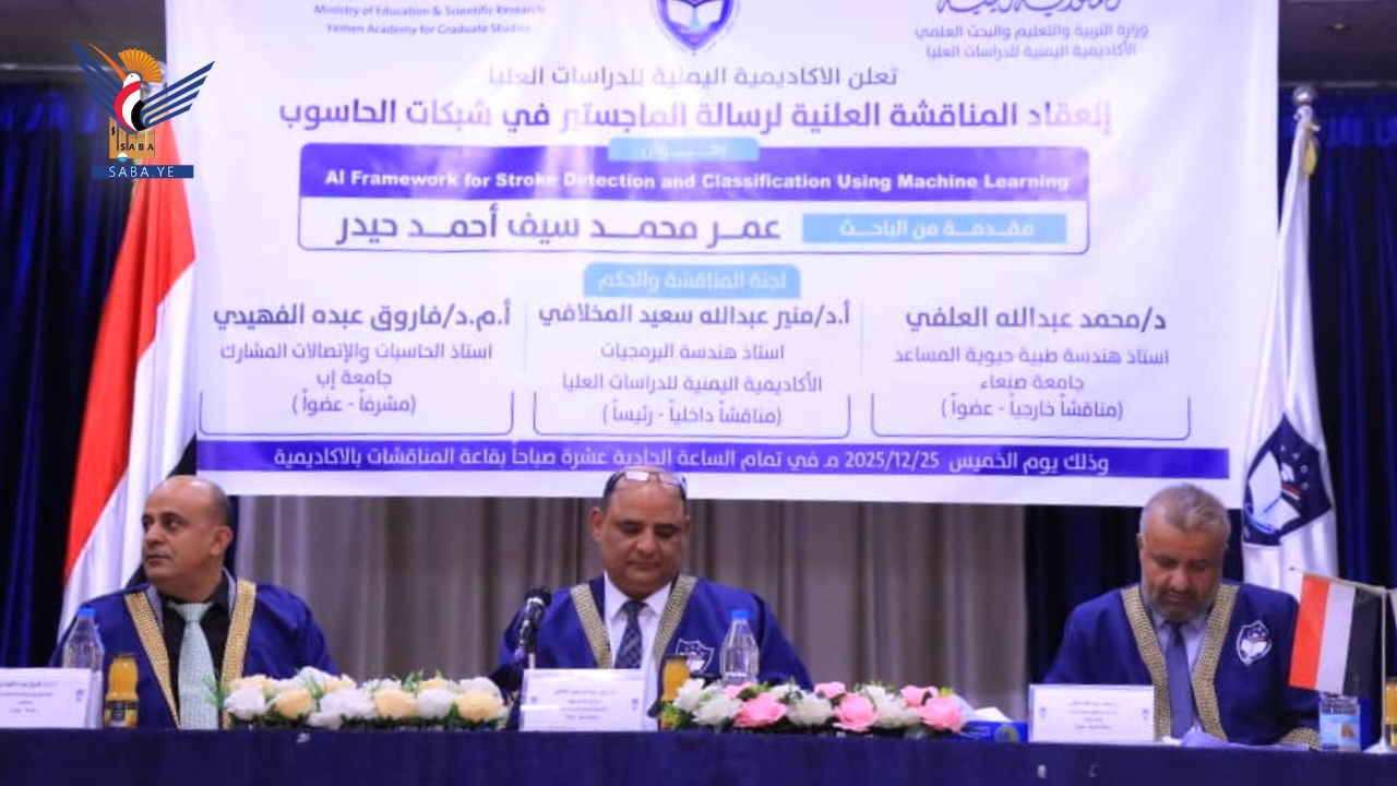 وأشادت لجنة المناقشة والحكم برئاسة الدكتور منير المخلافي، وعضوية الدكتور محمد العلفي، والدكتور فاروق الفهيدي، بجهود الباحث العملية وما توصلت إليه الرسالة من نتائج هدفت إلى توظيف تقنيات الذكاء الصناعي في تشخيص حالات الجلطات والنزيف الدماغي.