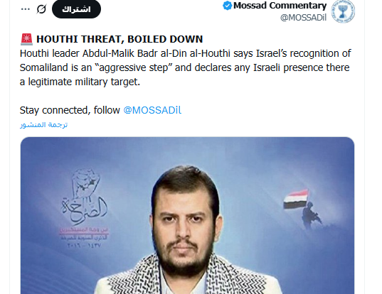 وفي خطوة تعكس المخاوف الصهيونية من تهديد رسائل السيد الحوثي، نشر موقع "الموساد" 'الإسرائيلي' صورة القائد الحوثي على حسابه الرسمي على منصة "X"، معلقاً: "هذا هو تهديد زعيم 'أنصار الله': إن اعتراف العدو الإسرائيلي بإقليم 'صوماليالند' خطوة عدوانية، وأن أي وجود "إسرائيلي" في الإقليم سيكون هدفاً عسكرياً مشروعاً للقوات اليمنية".