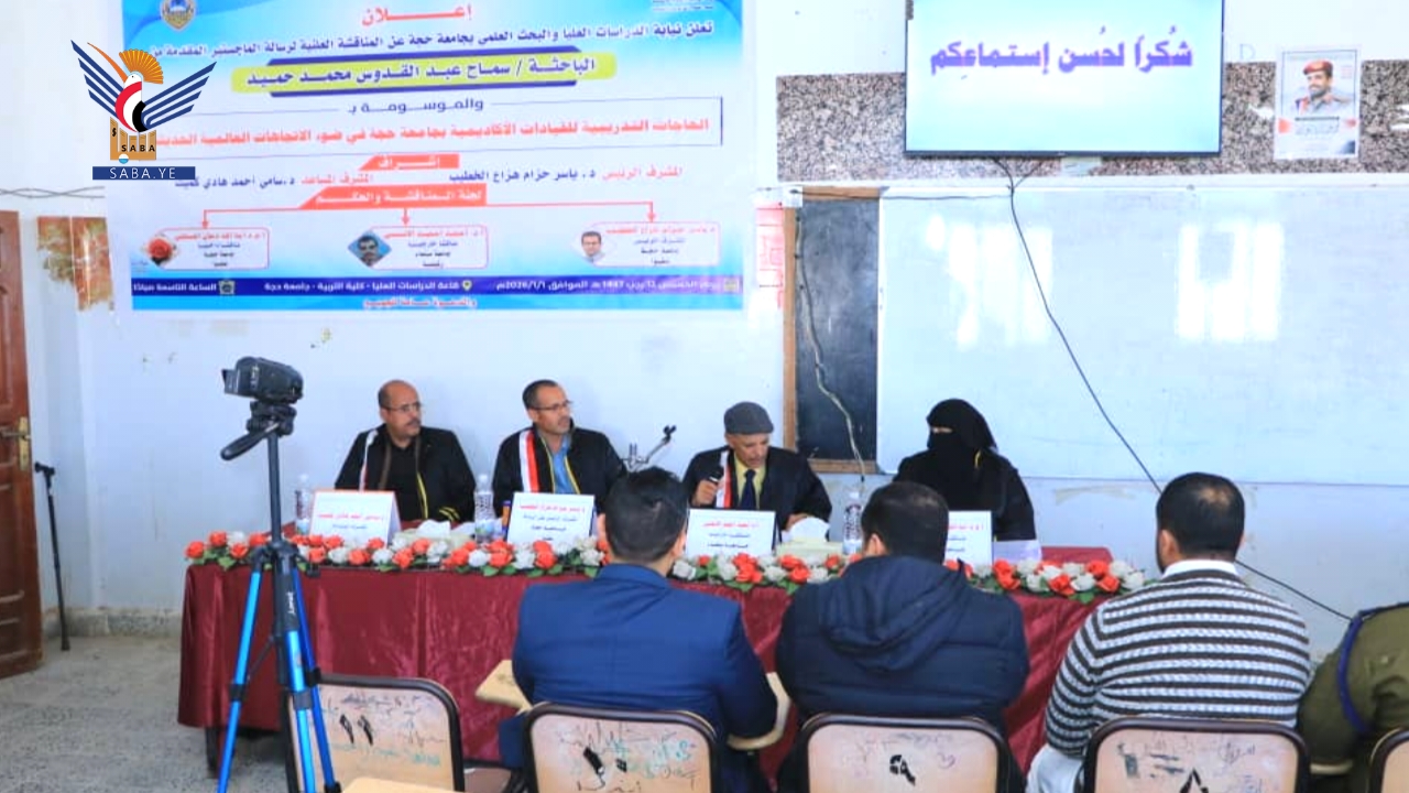 وأوصت اللجنة في المناقشة بحضور رئيس الجامعة الدكتور طه الحمزي ونواب ومساعدي رئيس الجامعة وعدد من عمداء الكليات بطباعة الأطروحة وتداولها بين الجامعات اليمنية لأهميتها في تطوير الحاجات التدريبية للقيادات الأكاديمية بجامعة حجة في ضوء الإتجاهات العالمية الحديثة.