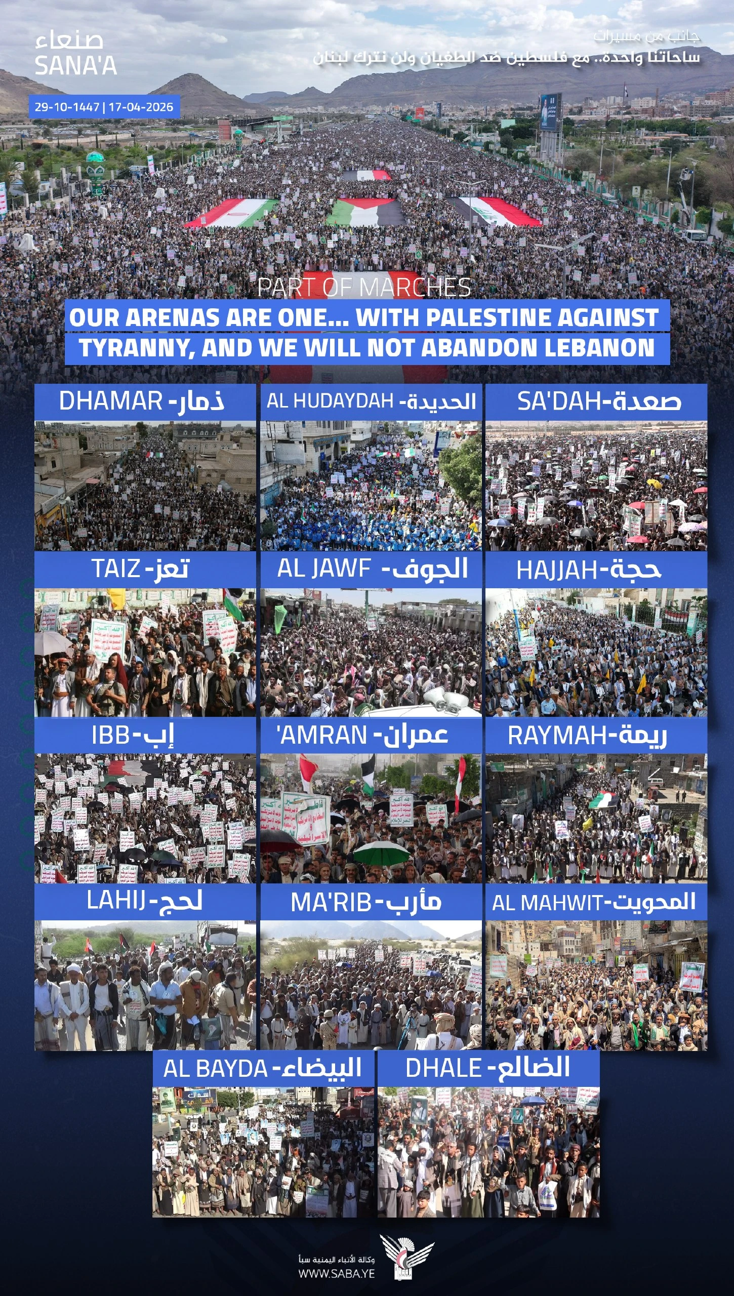 محافظة ريمة هي الأخرى شهدت 93 مسيرة جماهيرية تأكيدًا على ثبات الموقف مع لبنان وحزب الله وغزة والجهوزية لكل الخيارات.
