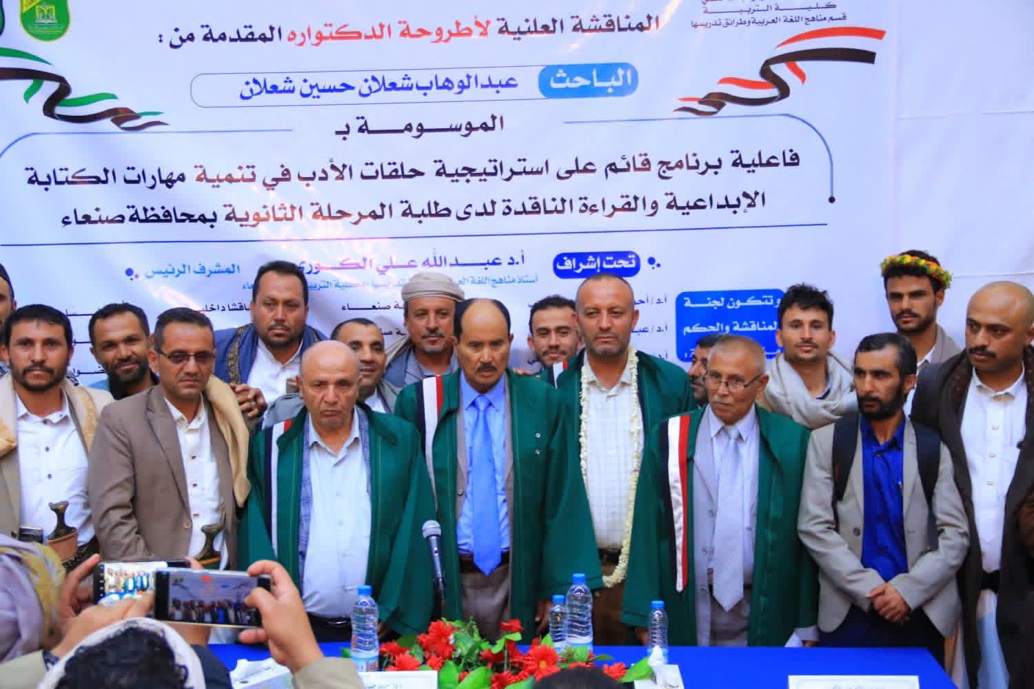 حضر مناقشة الأطروحة، اليوم الخميس، في كلية التربية بجامعة صنعاء، عدد من الأساتذة والأكاديميين والباحثين، وزملاء وأقارب الباحث شعلان.