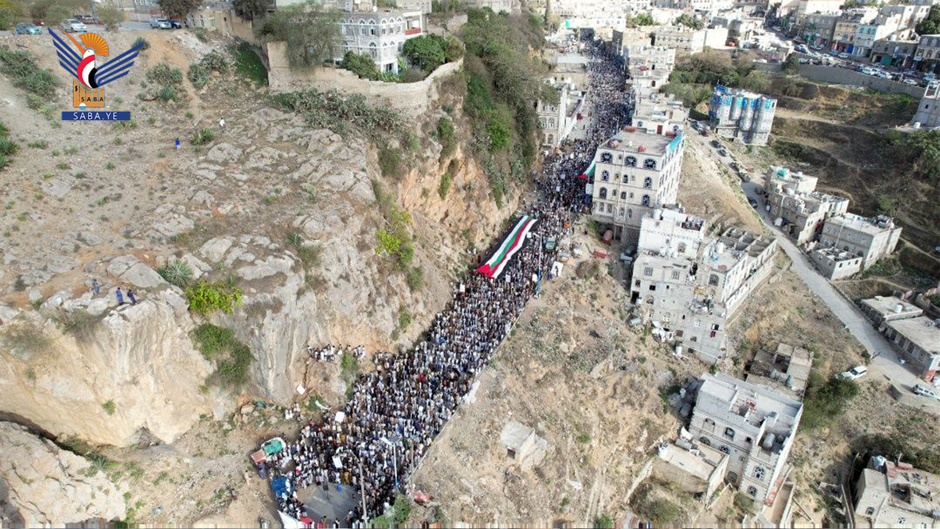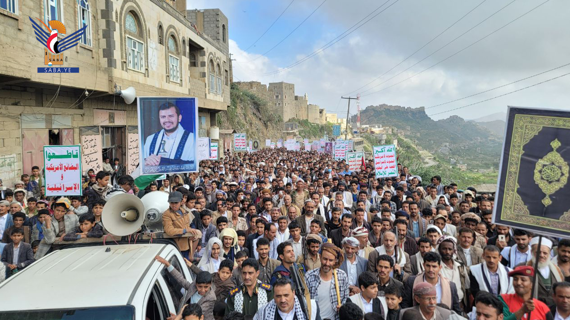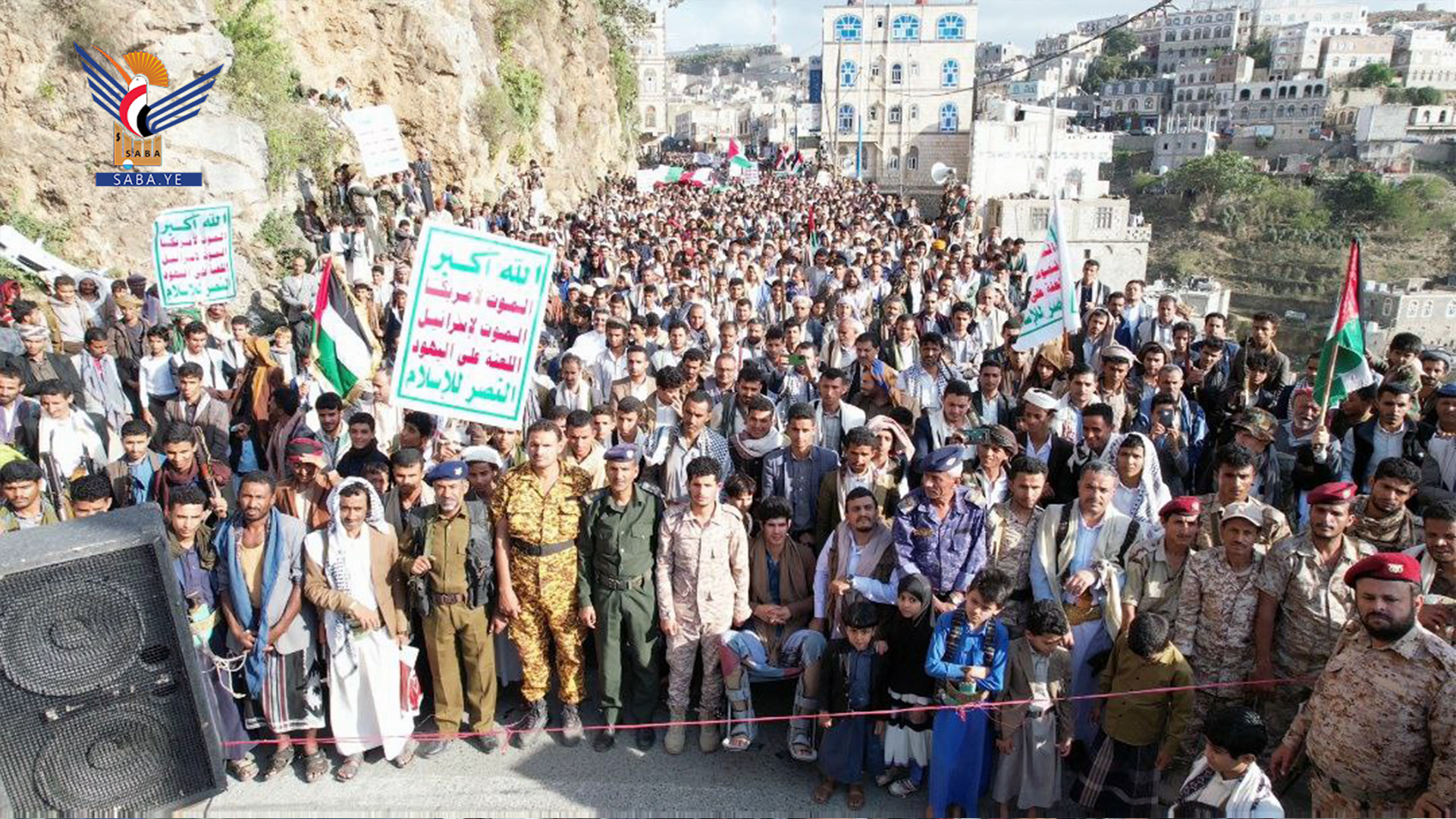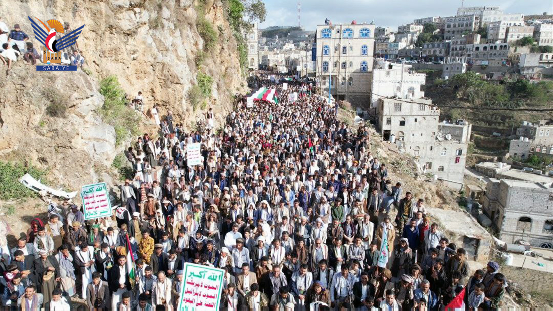 ورفعت الجماهير الحاشدة العلمين اليمني والفلسطيني واللافتات المناهضة لأمريكا وإسرائيل والمنددة بالجرائم الوحشية ومجازر الإبادة الجماعية التي يرتكبها العدو الصهيوني بحق الأطفال والنساء والمدنيين في قطاع غزة وفلسطين المحتلة، بدعم أمريكي غربي وتواطؤ عربي مخجل .