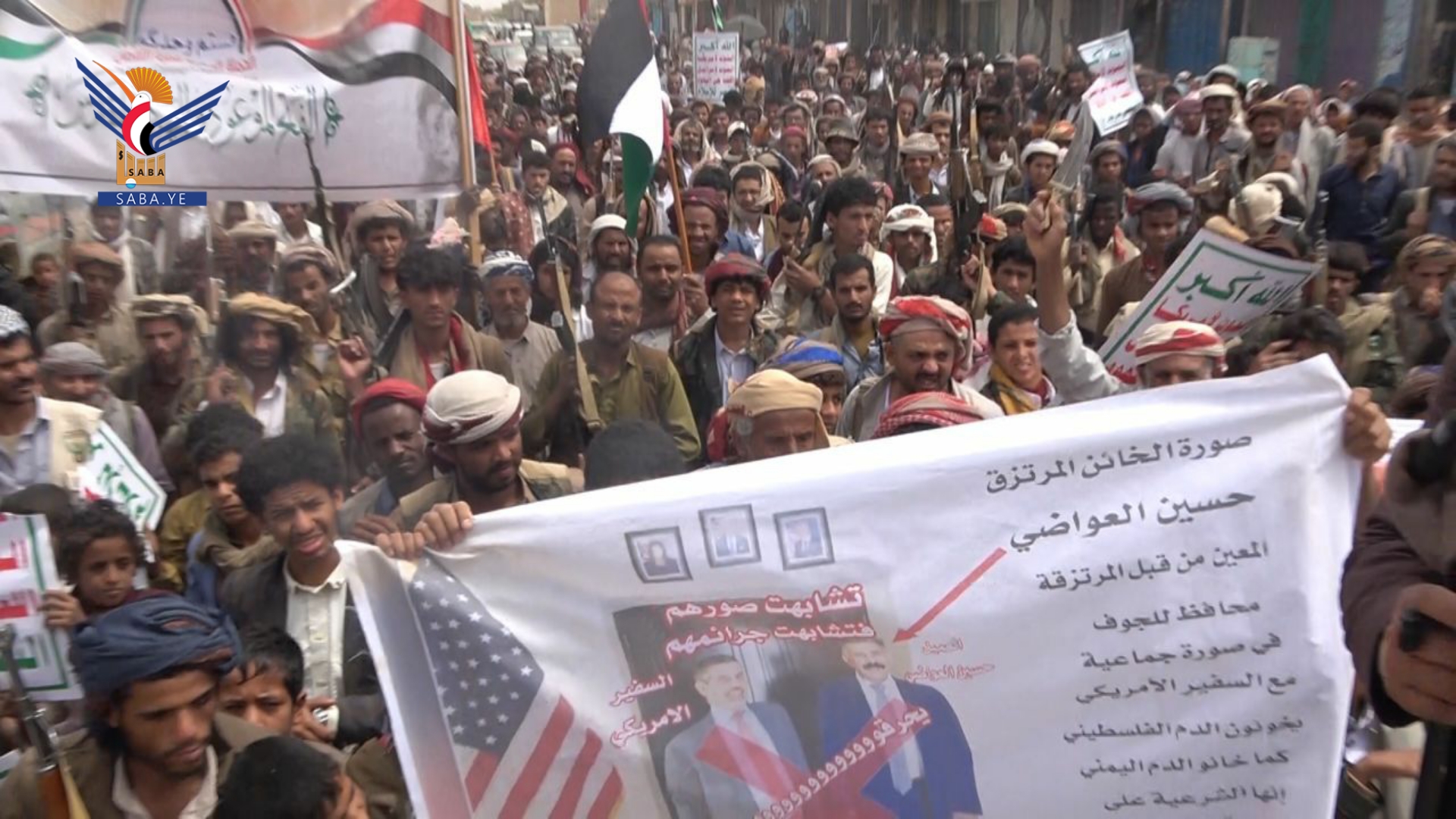 حيث خرج أبناء مديرية الحزم - مركز المحافظة في مسيرة حاشدة؛ رفضاً لاستمرار العدوان الإسرائيلي على أبناء غزة، الذين يتعرضون للإبادة الجماعية.. منددين بما يقوم به مرتزقة العدوان الأمريكي والسعودي من لقاءات مشبوهة تخدم العدو الصهيوني.