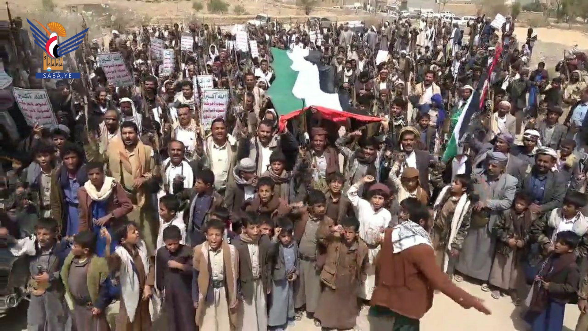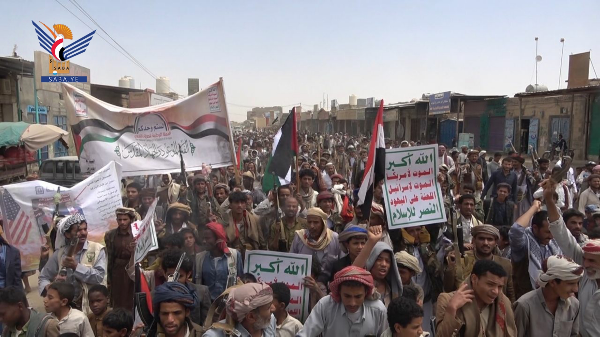 وشهدت الحميدات - مركز المديرية، ومناطق الواغرة والمراشي ورجوزة والعنان ومناطق رحوب والمربع الغربي للعنان ومنطقة اليتمة في خب الشعف، مسيرات حاشدة؛ تنديدا باستمرار العدوان الصهيوني- الأمريكي على قطاع غزة.