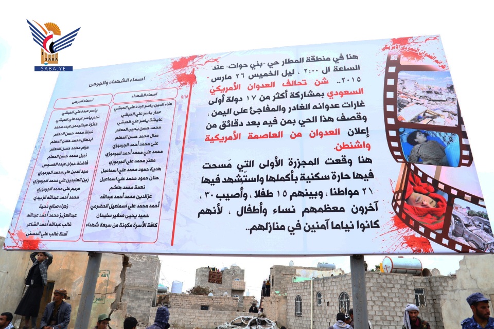 وفي الفعالية التي أقيمت في مكان أول غارة وجريمة لطيران العدوان الأمريكي السعودي في حارة البلس بحي المطار، أكد عضو المجلس السياسي الأعلى محمد علي الحوثي، أن أبن سلمان دشن الغارات الأولى على الجمهورية اليمنية في منطقة بني حوات بمديرية بني الحارث استهدف بها المدنيين الساكنين في بيوتهم.