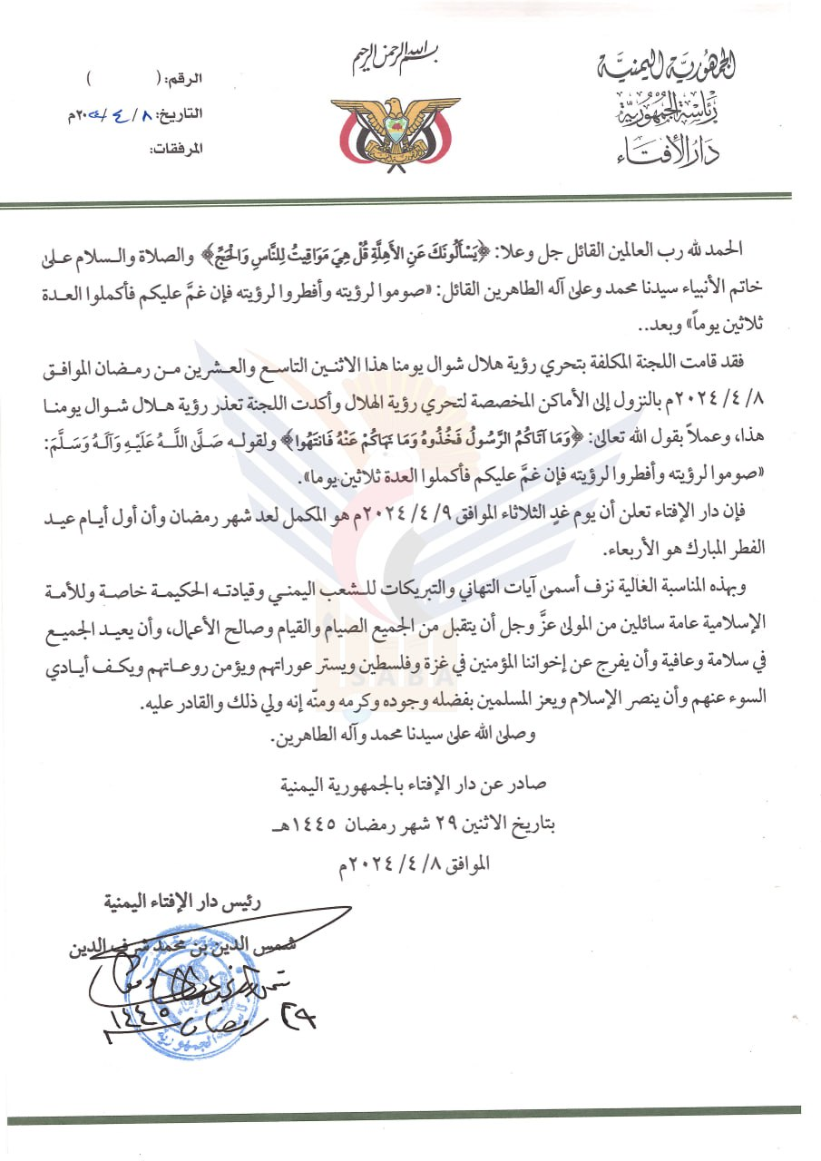صادر عن دار الإفتاء بالجمهورية اليمنية بتاريخ الإثنين 29 رمضان 1445هـ الموافق 8 أبريل 2024م.