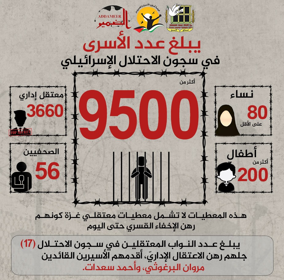 ووفقاً لورقة حقائق صادرة عن مؤسسات الأسرى الفلسطينية، عشية يوم الأسير الفلسطيني، فإنّ عدد الأسرى في سجون العدو الصهيوني يبلغ حالياً أكثر من 9500 أسير وأسيرة، وهذا المعطى لا يشمل معتقلي غزّة كافّة الذين يخضعون لجريمة (الإخفاء القسري)، فيما يبلغ عدد الأسيرات من بين مجموع الأسرى 80 أسيرة، منهنّ ثلاث أسيرات رهن الاعتقال منذ ما قبل السابع من أكتوبر، وكذلك أكثر من 200 طفل.