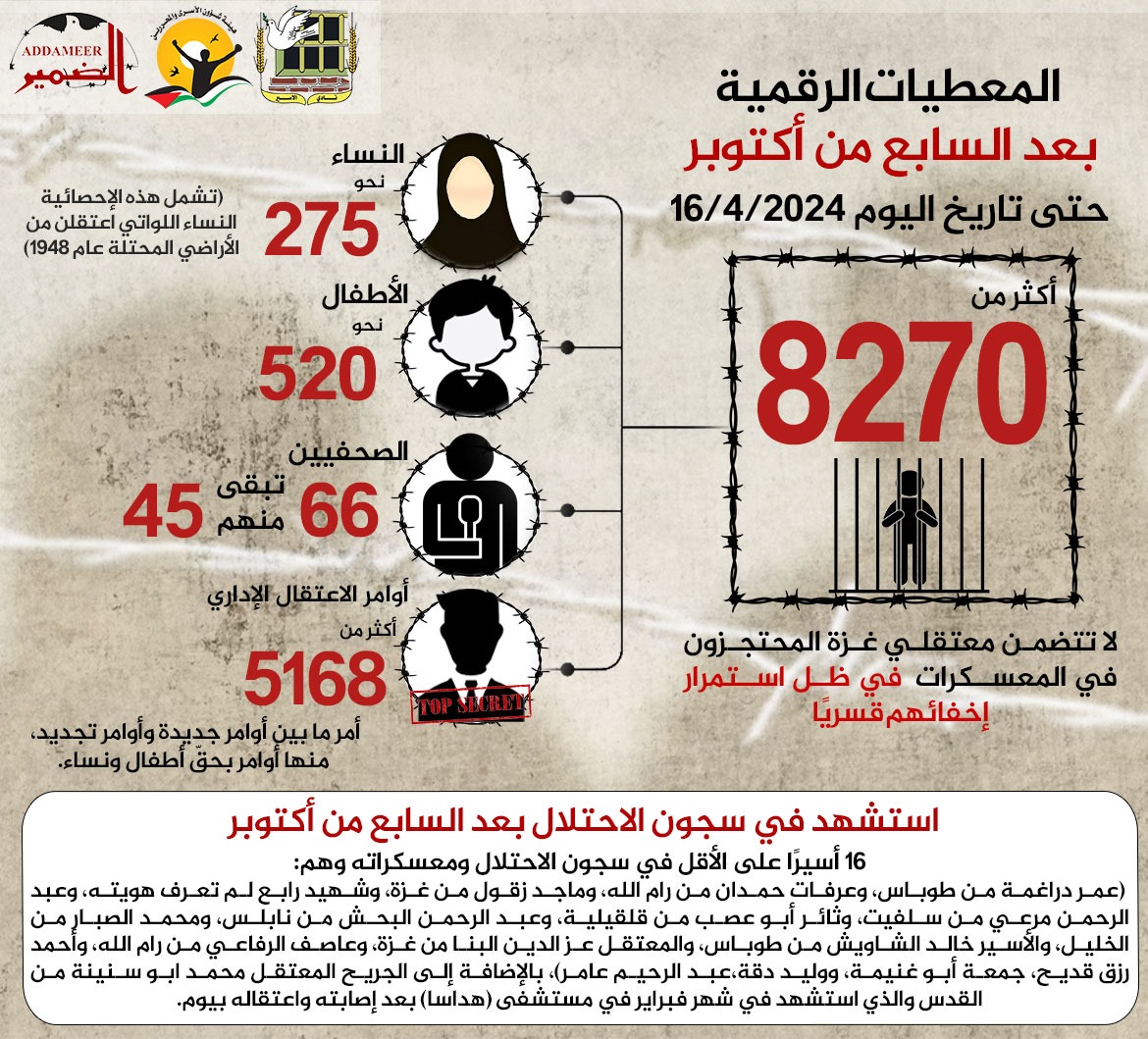 وبعد السابع من أكتوبر، بلغت حصيلة حملات الاعتقال أكثر من 8270 في الضفّة، بما فيها القدس المحتلة، تشمل من أفرج العدو الصهيوني عنهم أو أبقى على اعتقالهم، وفيهم نساء وأطفال وصحفيون، وبلغت أوامر الاعتقال الإداري بعد ذلك التاريخ أكثر من 5168 أمراً، ما بين أوامر جديدة وأوامر تجديد، منها أوامر بحقّ أطفال ونساء.
