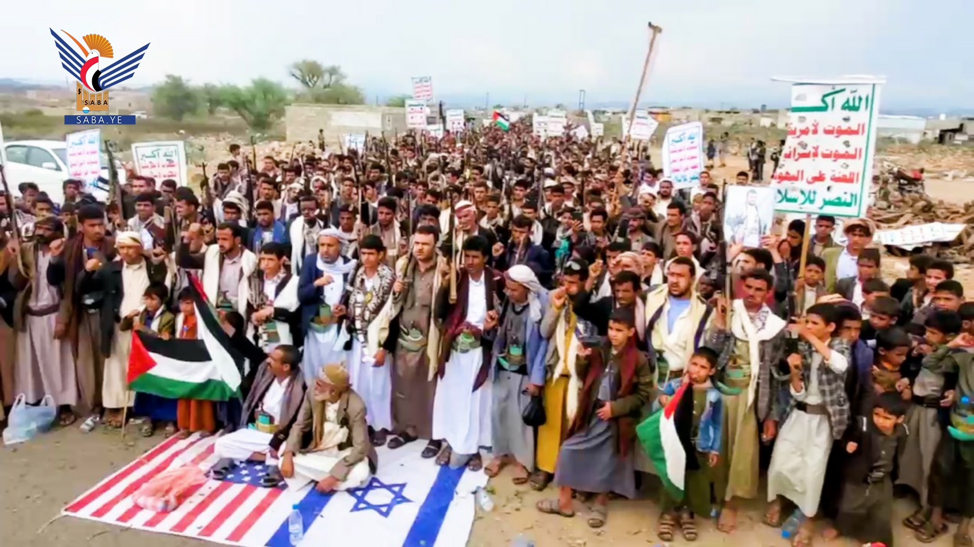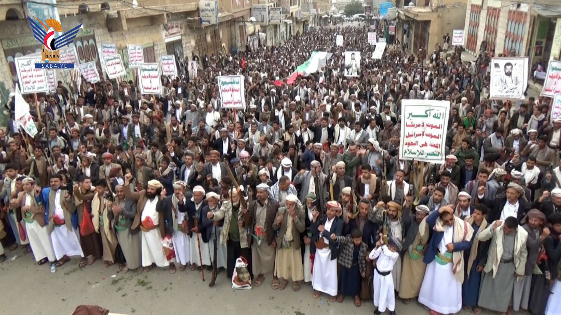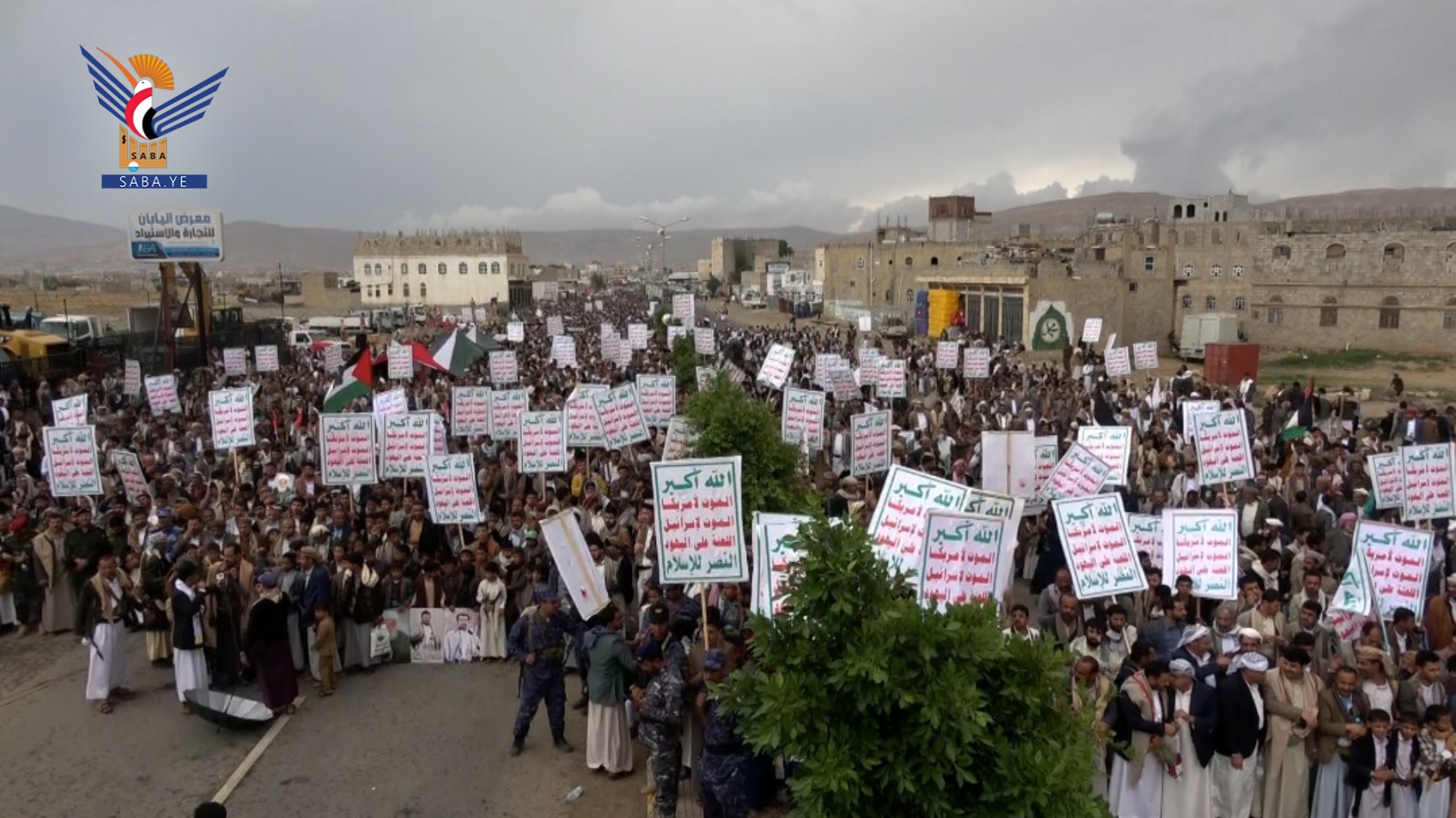 حيث شهدت مديريات عمران وعيال سريح وريدة وجبل يزيد مسيرة جماهيرية حاشدة في ساحة شارع الشهيد الرئيس صالح الصماد بمدينة عمران؛ تضامناً ونصرة للشعب الفلسطيني ومقاومته الباسلة.