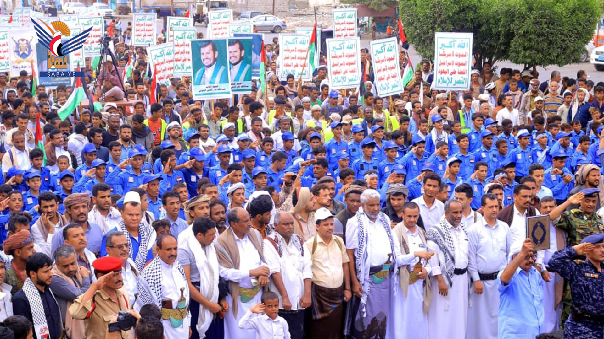وهتف المشاركون في المسيرات التي شملت أكثر من 23 ساحة بمركز المحافظة والمديريات، بشعارات البراءة من أعداء الله، حاملين رايات النصر وأعلام اليمن وفلسطين والشعارات المناوئة لثالوث الشر الأمريكي البريطاني الصهيوني.