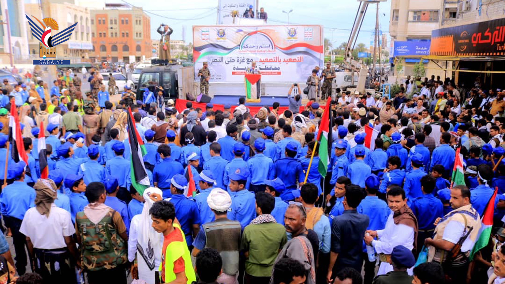 احتشد أبناء محافظة الحديدة، عصر اليوم في مسيرات جماهيرية كبرى تحت شعار "التصعيد بالتصعيد.. مع غزة حتى النصر"، لتجديد التضامن مع الشعب الفلسطيني وإعلان النفير في مواجهة الأعداء.