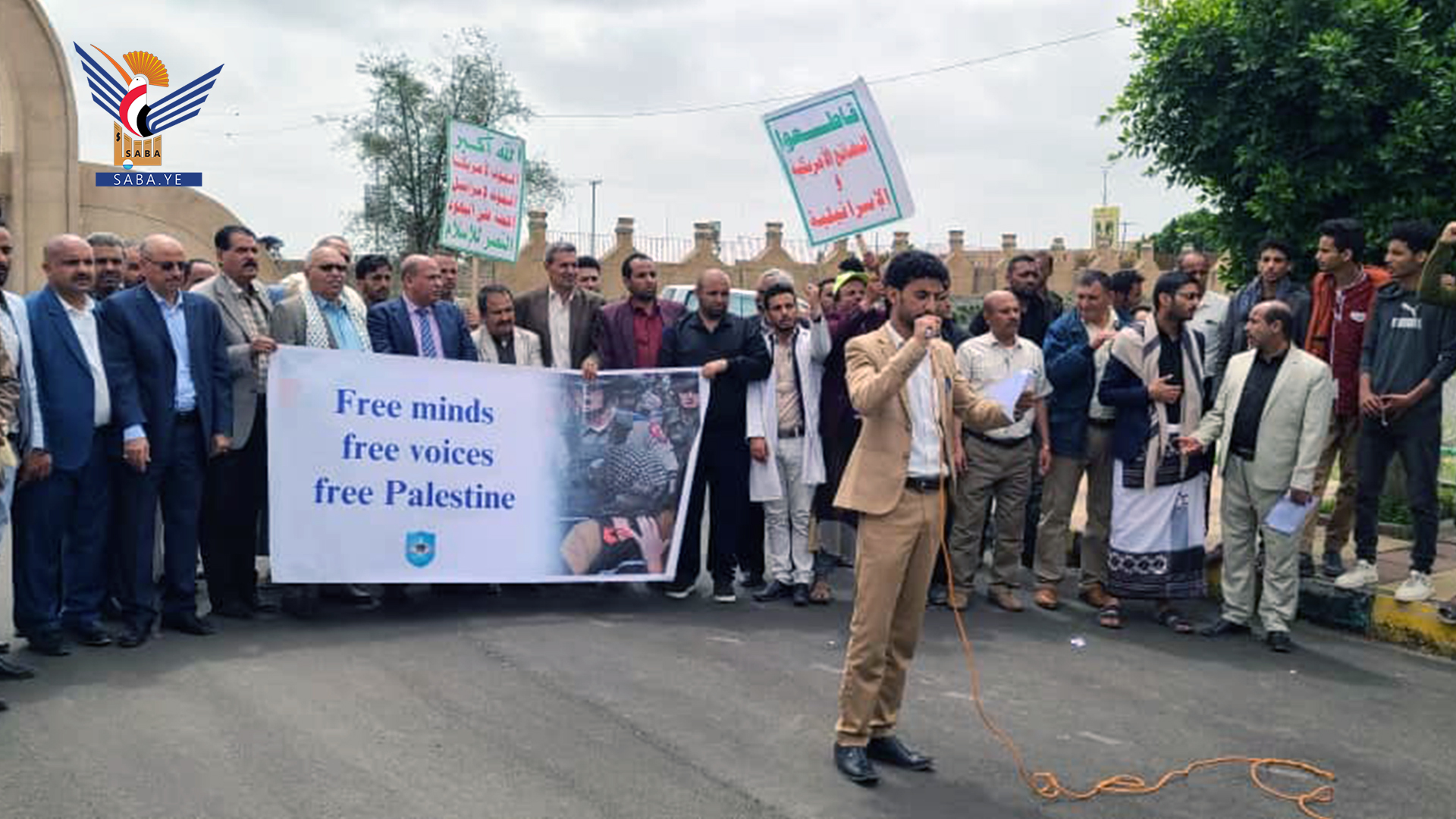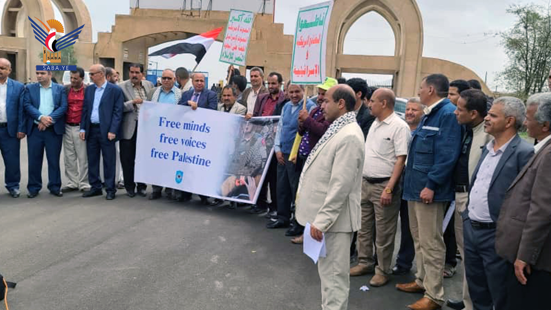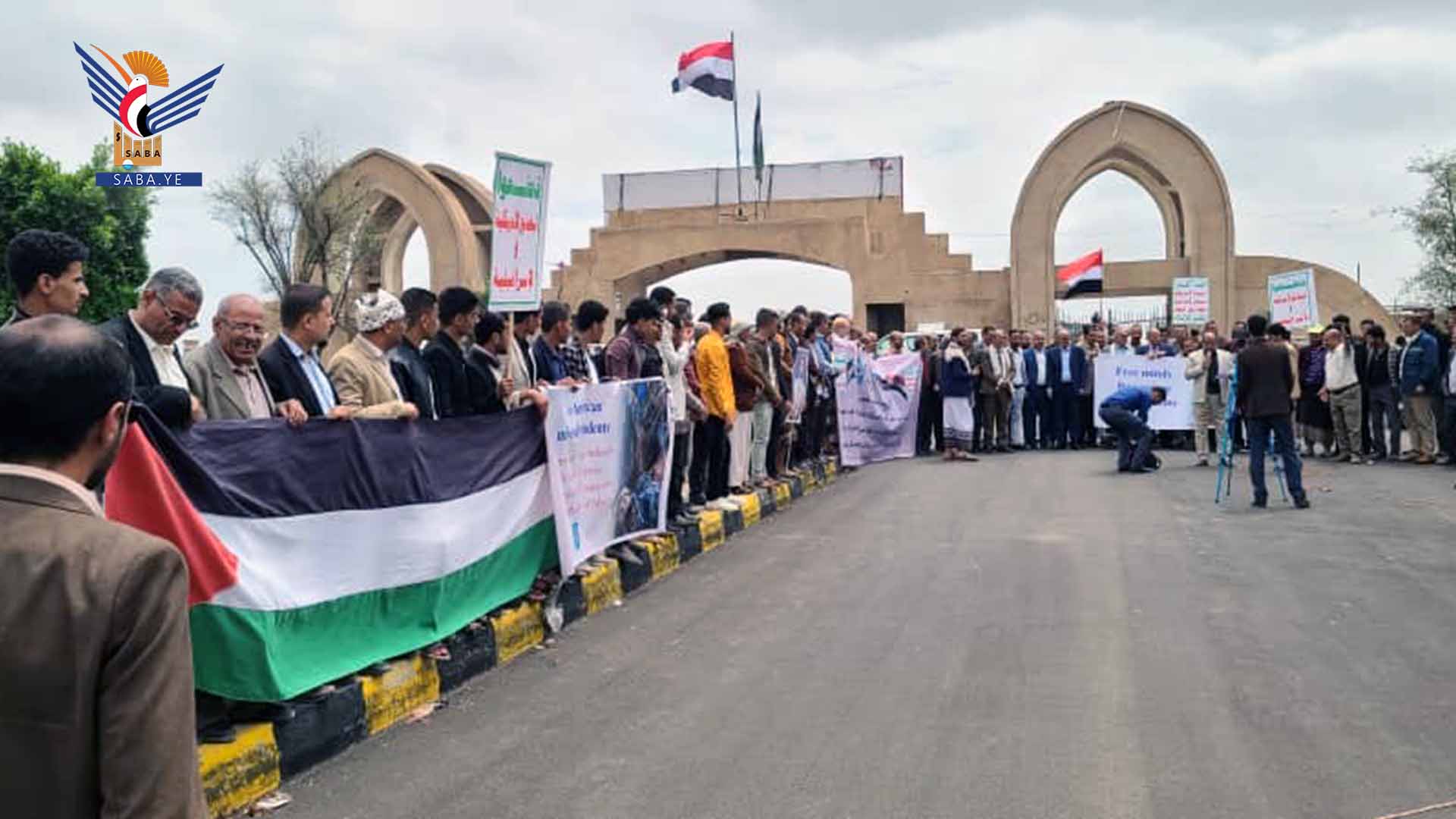 نظم منتسبو جامعة ذمار اليوم وقفة احتجاجية تنديداً باستمرار المجازر بحق الشعب الفلسطيني وتضامناً مع الحراك الأكاديمي والطلابي في الجامعات الأمريكية والأوروبية الذين يتعرضون لقمع واعتقالات على خلفية موقفهم المناصر للشعب الفلسطيني في قطاع غزة.