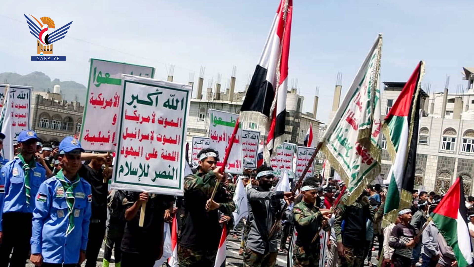 كما رددوا هتافات التفويض لقيادة الثورة بتنفيذ كافة الخيارات المناسبة لدعم الشعب والمقاومة الفلسطينية واستمرار قصف الأهداف والمصالح الصهيونية سواءً في الاراضي المحتلة او في السفن العابرة في البحرين الاحمر والعربي وخليج عدن والبحر المتوسط.
