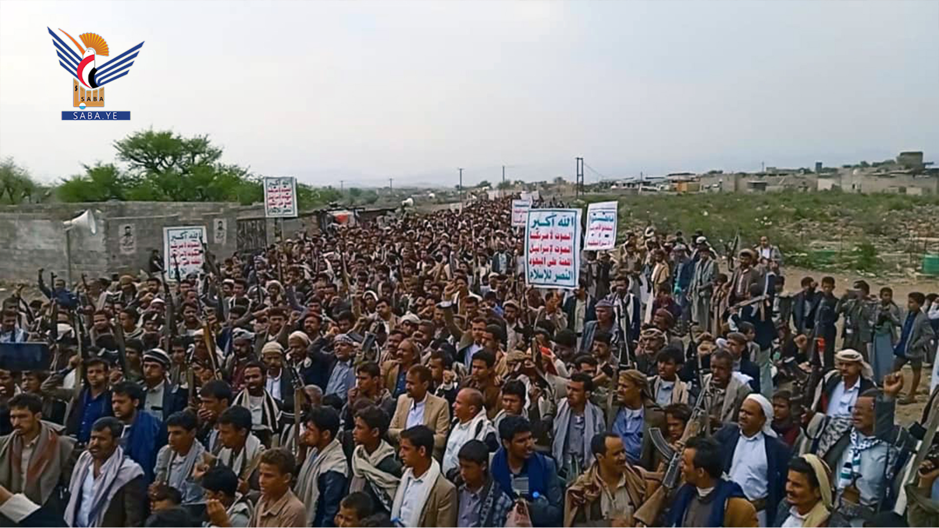 وشهدت مديريات خارف وريدة وخمر وذيبين وبني صريم وحوث، خروج مسيرات حاشدة، تقدمها أمين عام محلي المحافظة، صالح المخلوس، ووكلاء المحافظة، أمين فراص ومحمد المتوكل وعبدالغني البروشي، ومدراء عموم المديريات والقيادات التعبوية والتربوية والثقافية والمشايخ والوجاهات، ردد المشاركون فيها العِبارات المؤيدة لقائد الثورة، وكل خياراته في ردع العدو السعودي والأمريكي والبريطاني والصهيوني، ومن يتورط معه، وأنهم في جهوزية منتظرون توجيهاته.