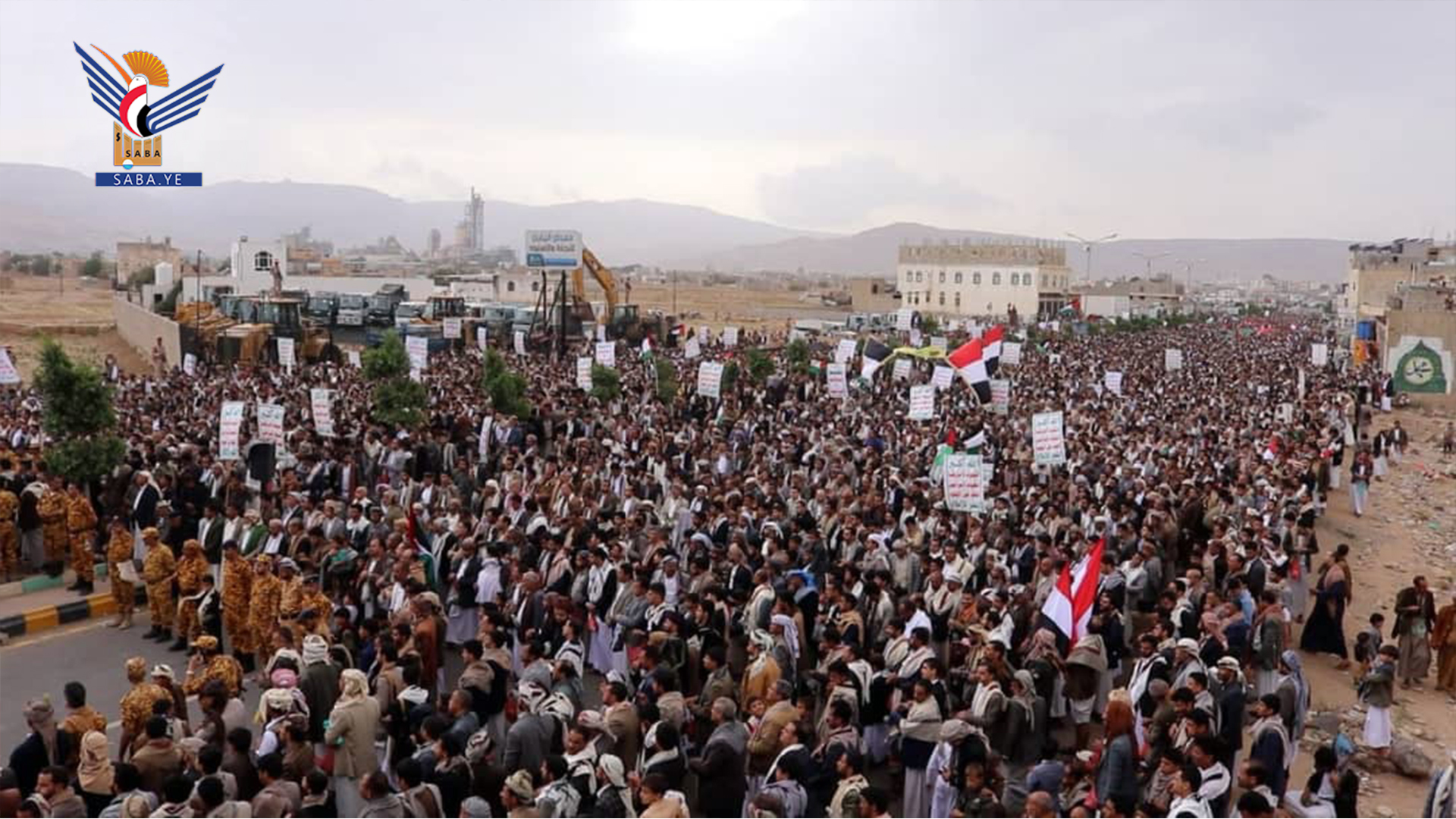 وهتفت الجماهير بصوت واحد: "جرائمكم ومجازركم بحق الشعبين الفلسطيني واليمني، وكذا تهديداتكم، لن تثنينا عن دعم وإسناد فلسطين ومجاهديه الأبطال، ولن نوقف عملياتنا العسكرية حتى إيقاف العدوان على عزة ورفع الحصار".