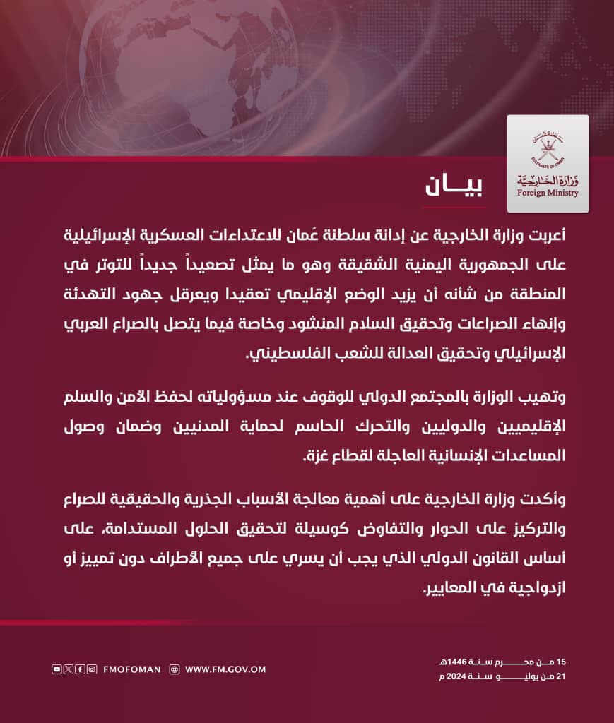 وقالت وزارة الخارجية العمانية في بيان لها: إن العدوان الصهيوني على اليمن يمثل تصعيدا جديدا للتوتر في المنطقة من شأنه أن يزيد الوضع الإقليمي تعقيدا ويعرقل جهود التهدئة وإنهاء الصراعات، وتحقيق السلام المنشود وخاصة فيما يتصل بالصراع العربي الصهيوني وتحقيق العدالة للشعب الفلسطيني.