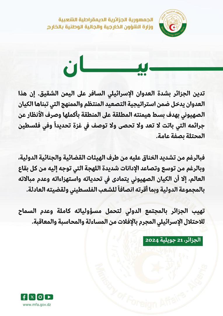 أدانت الجزائر بشدة العدوان الصهيوني السافر على اليمن.. مطالبة المجتمع الدولي بتحمل مسؤولياته كاملة وعدم السماح لكيان الاحتلال بالإفلات من المساءلة والمحاسبة والمعاقبة.