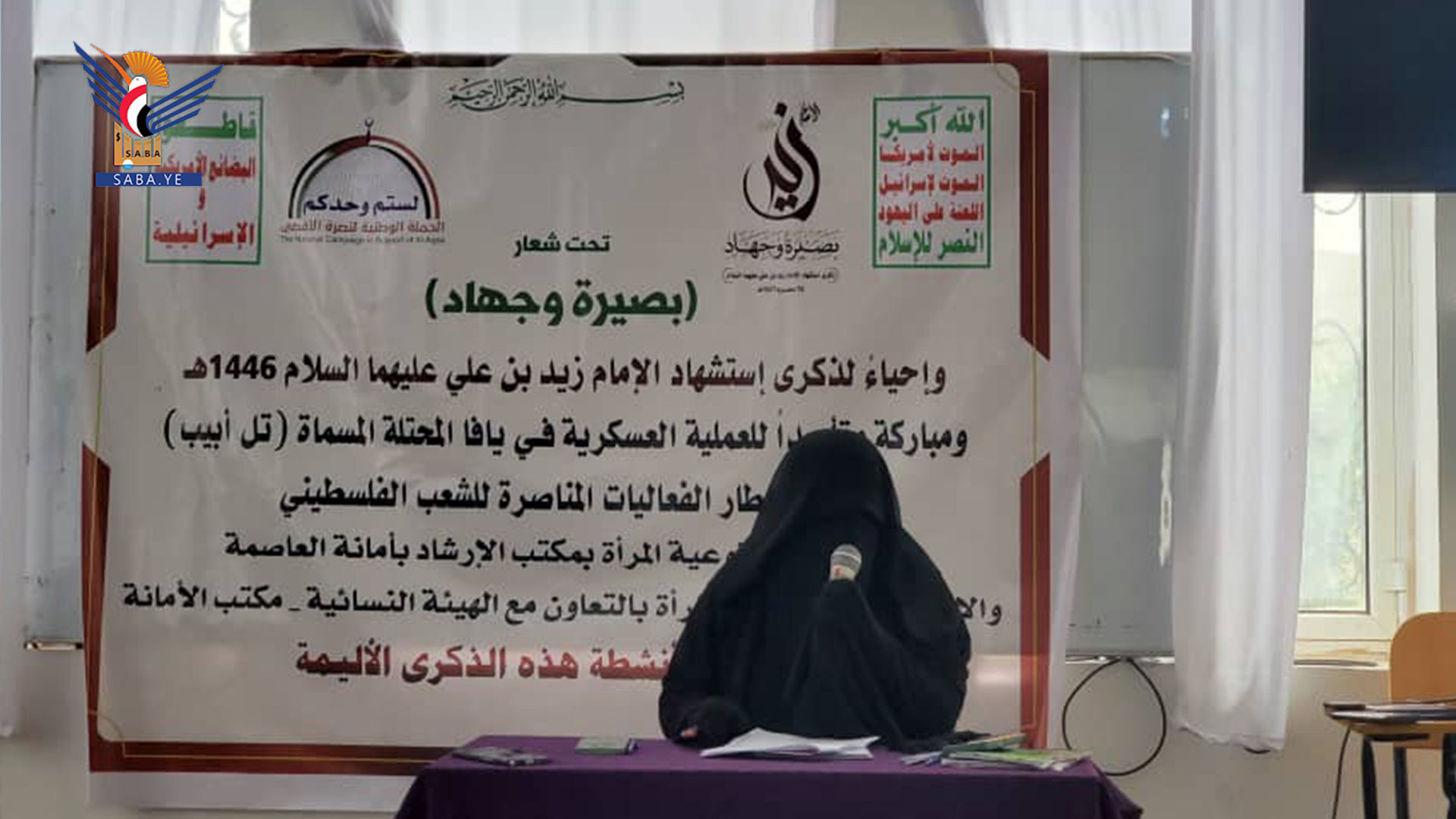دشنت إدارة توعية المرأة بمكتب الإرشاد والإدارة العامة لتنمية المرأة، بالتعاون مع الهيئة النسائية بأمانة العاصمة، اليوم، فعاليات إحياء ذكرى استشهاد الإمام زيد بن علي عليهما السلام تحت شعار "بصيرة وجهاد"، ومباركة للعملية العسكرية النوعية في "يافا" المحتلة.