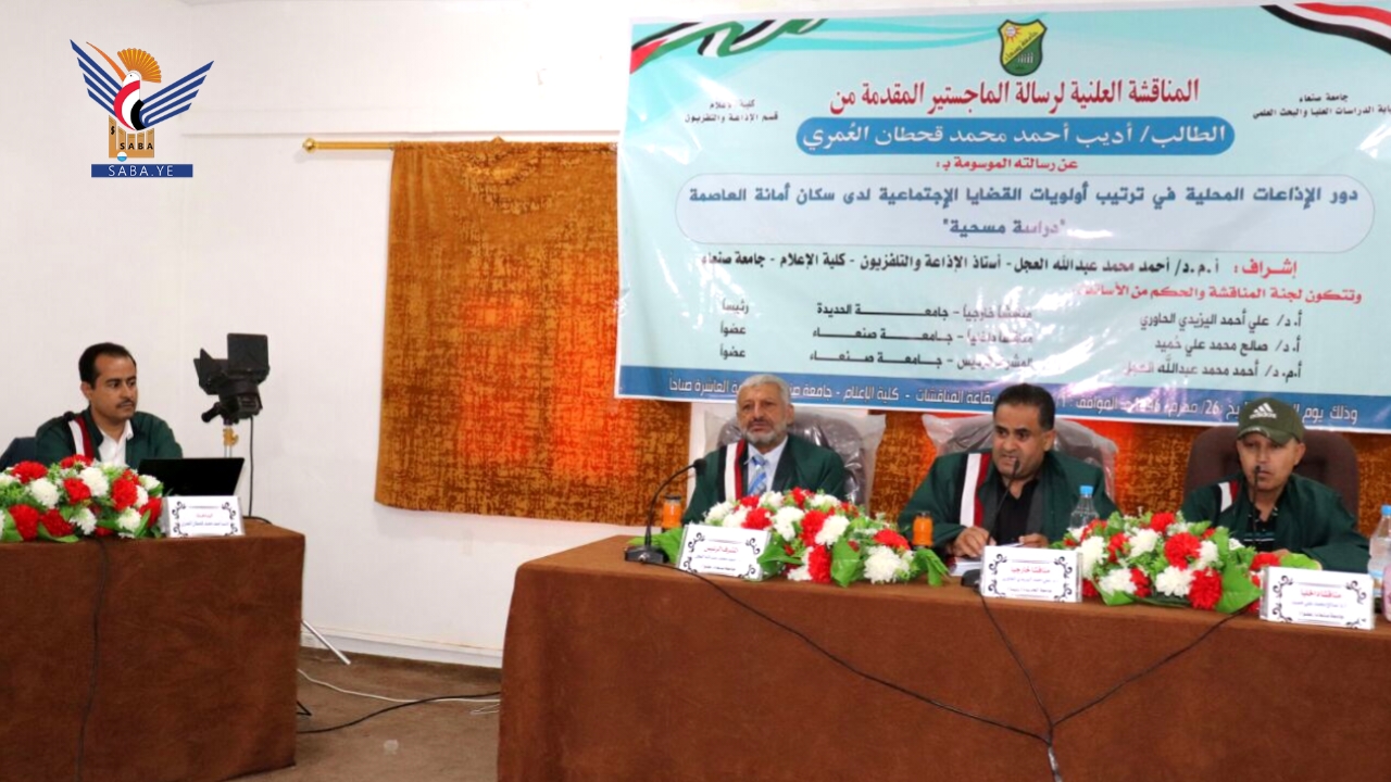 حصل الباحث أديب أحمد العمري، على درجة الماجستير بامتياز من قسم الإذاعة والتلفزيون بكلية الإعلام جامعة صنعاء، عن رسالته الموسومة بـ"دور الإذاعات المحلية في ترتيب أولويات القضايا الإجتماعية لدى سكان أمانة العاصمة - دراسة مسحية".