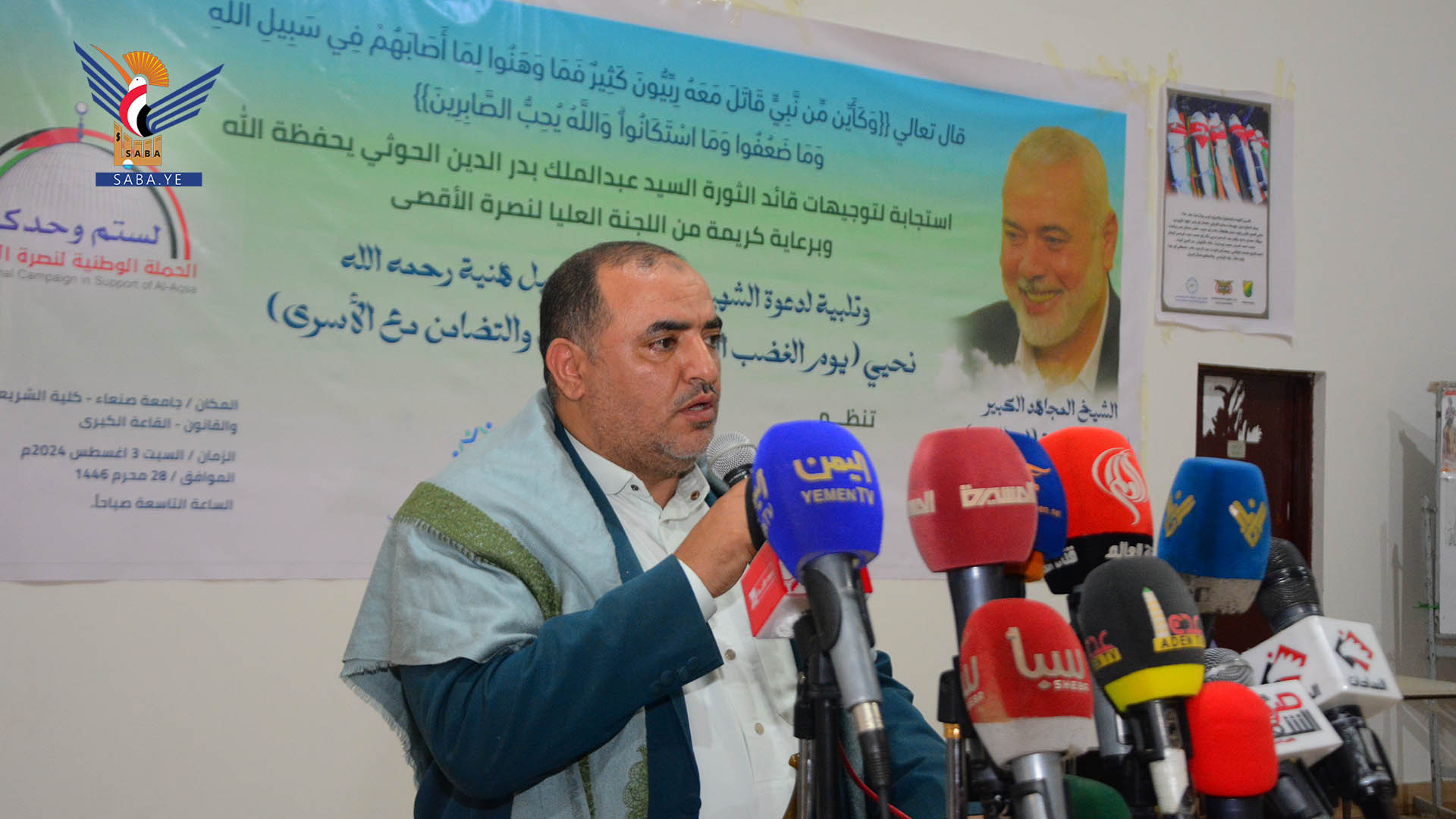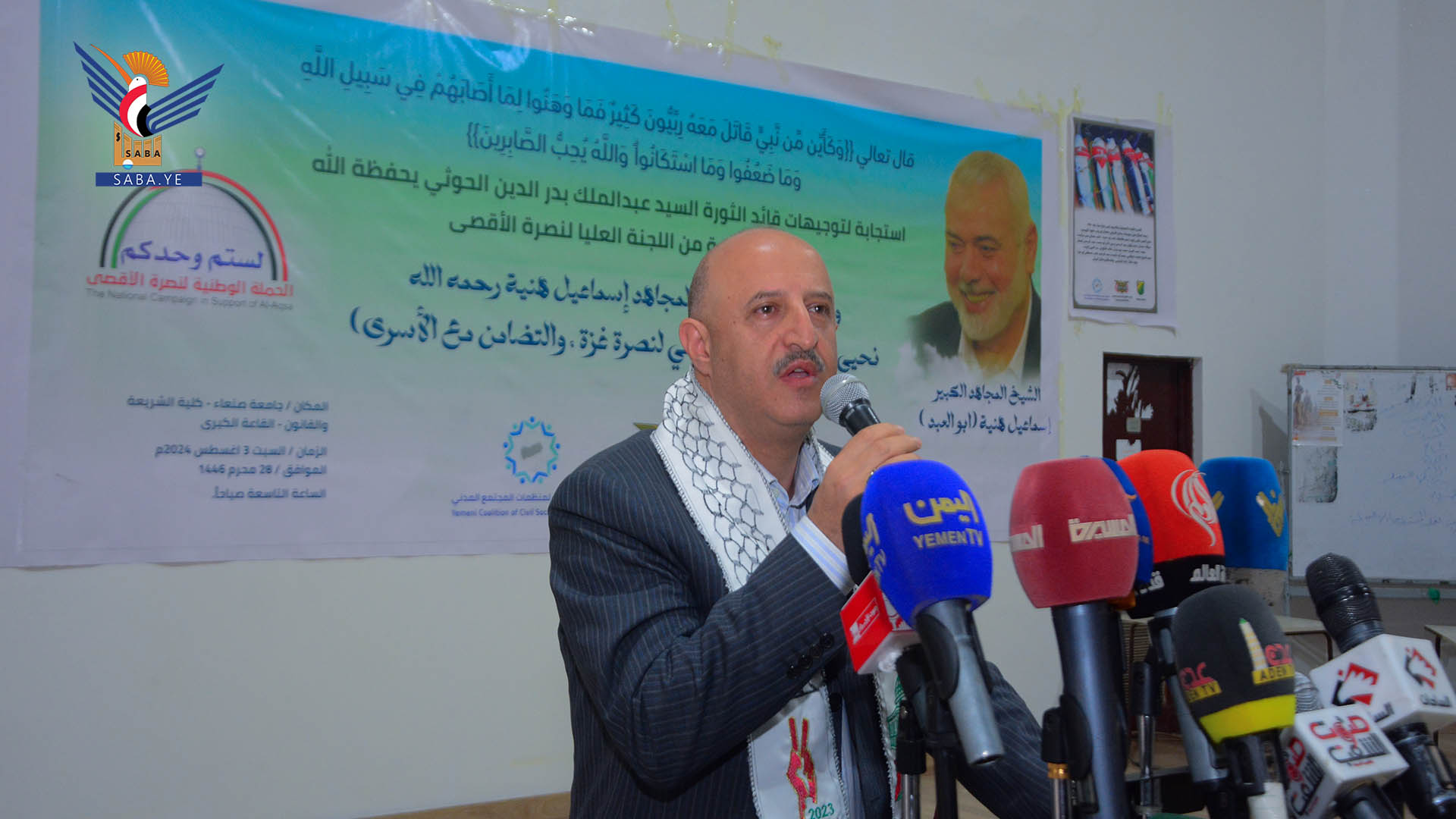 وأشار رئيس جامعة صنعاء إلى أن استهداف القادة هو من تدبير أمريكا وأن الكيان الصهيوني أخذ الموافقة منها لتنفيذ العملية الإرهابية الجبانة بحق المجاهد هنية.. مؤكدا أن دمائه الطاهرة ستكون صاعقة تحرق كيان العدو الغاصب ووبالاً على أمريكا وعملائها الذين يقدمون المساعدات للعدو.