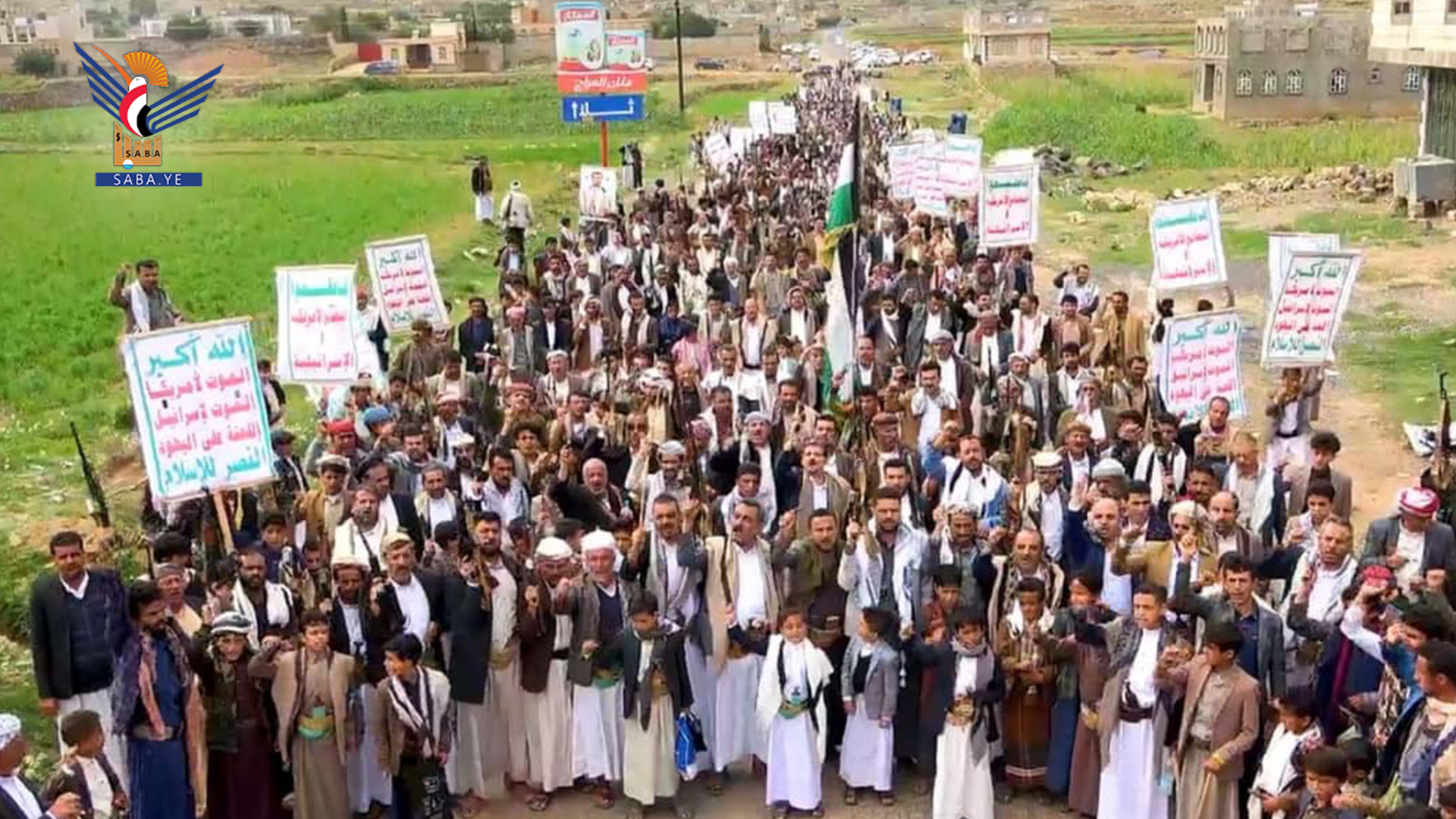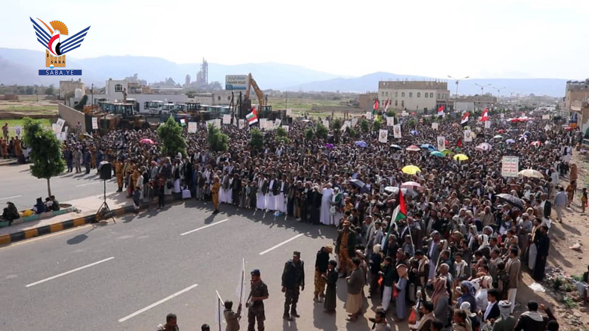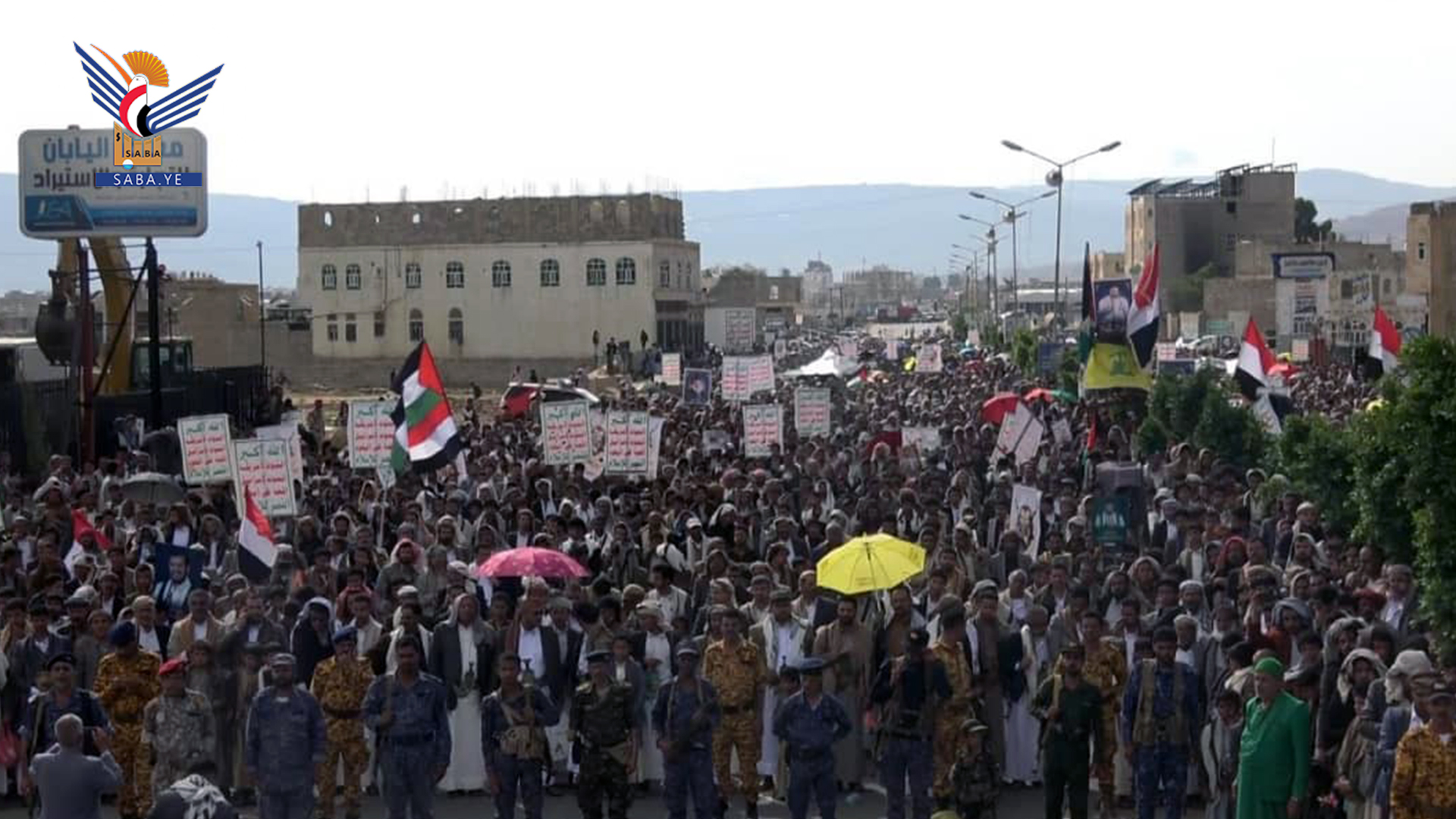 ورفعت الجماهير في المسيرة التي تقدمها بمدينة عمران محافظ المحافظة الدكتور فيصل جعمان، ومسؤول التعبئة العامة سجاد حمزة، ووكلاء المحافظة، الشعارات المعبرة عن التضامن مع الأشقاء في غزة والأراضي الفلسطينية المحتلة.