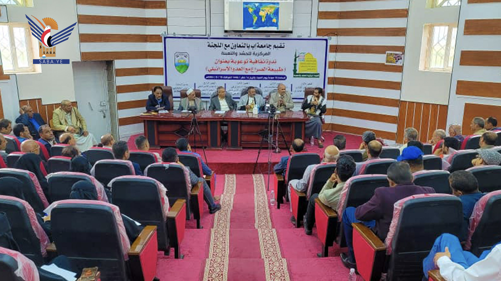 نظمت جامعة إب بالتعاون مع اللجنة المركزية للحشد والتعبئة وبمشاركة جامعتي صعدة والبيضاء ندوة ثقافية بعنوان "طبيعة الصراع العربي الإسرائيلي".