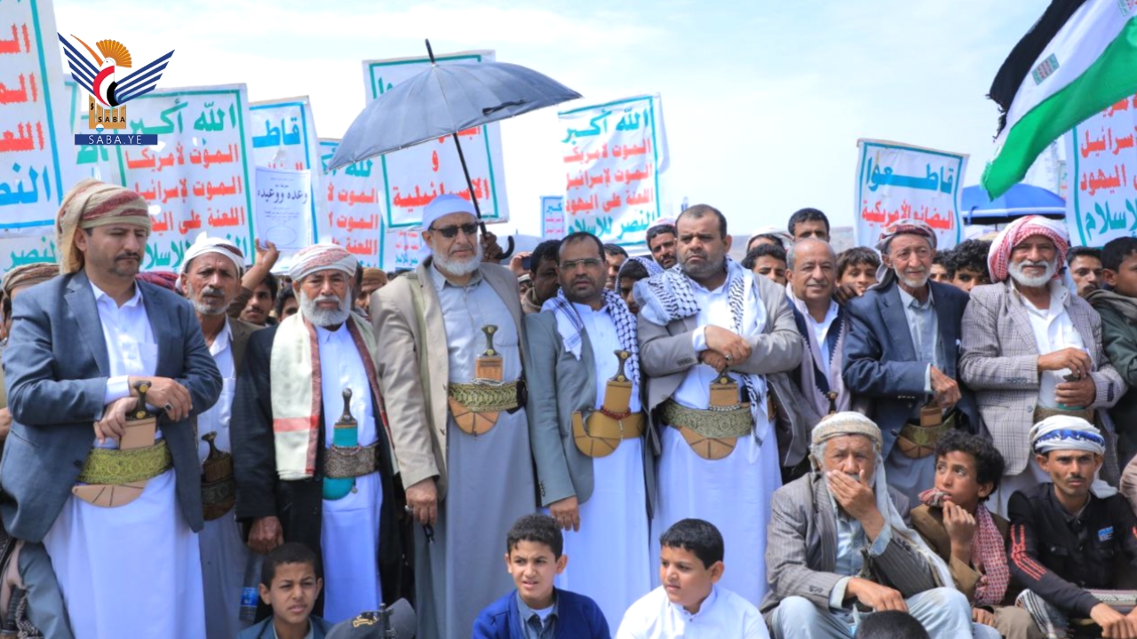 وفي المسيرات الكبرى، التي خرجت بساحة المولد النبوي الشريف بمركز المحافظة وساحة الشهيد القائد بخولان عامر ،ومديريات غمر وقطابر وآل سالم ومنبه وشداء وكتاف والحشوةوباقم ، وساحتي عرو وجمعة بني بحر ، والعين والقهرة في الظاهر ، وشعار والحجلة وبني صياح في رازح ، وربوع الحدود ومدينة جاوي وبني عباد في مجز ، وفي ذويب بحيدان وفي حنبة وآل ثابت بمديرية قطابر، أعلن المشاركون استمرار العمليات والأنشطة المساندة للشعب الفلسطيني وفاءً لدماء الشهداء حتى تنتصر غزة بإذن الله تعالى .
