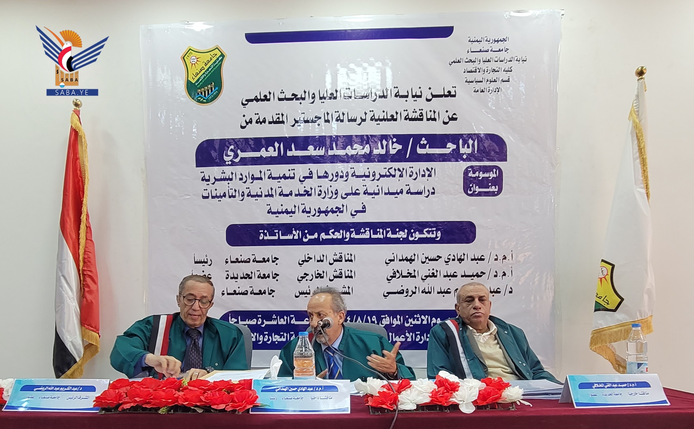 حصل الباحث خالد محمد العمري، على درجة الماجستير بامتياز مع مرتبة الشرف من قسم العلوم السياسية بكلية التجارة والاقتصاد في جامعة صنعاء عن رسالته الموسومة بـ " الإدارة الإلكترونية ودورها في تنمية الموارد البشرية .. دراسة ميدانية على وزارة الخدمة المدنية والتأمينات في الجمهورية اليمنية".
