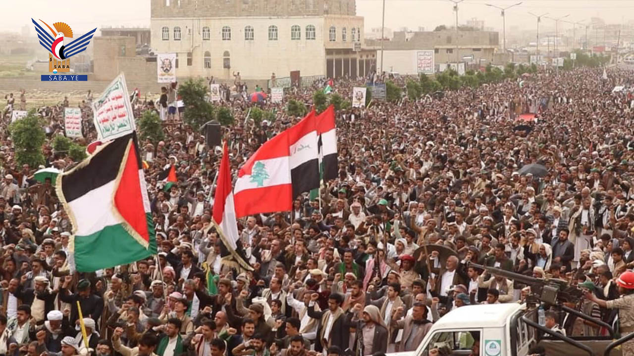 ورددت الجماهير الهتافات الغاضبة والمتوعدة للعدو الصهيوني الأمريكي بالرد المزلزل على جرائمهم بحق الأشقاء في غزة.