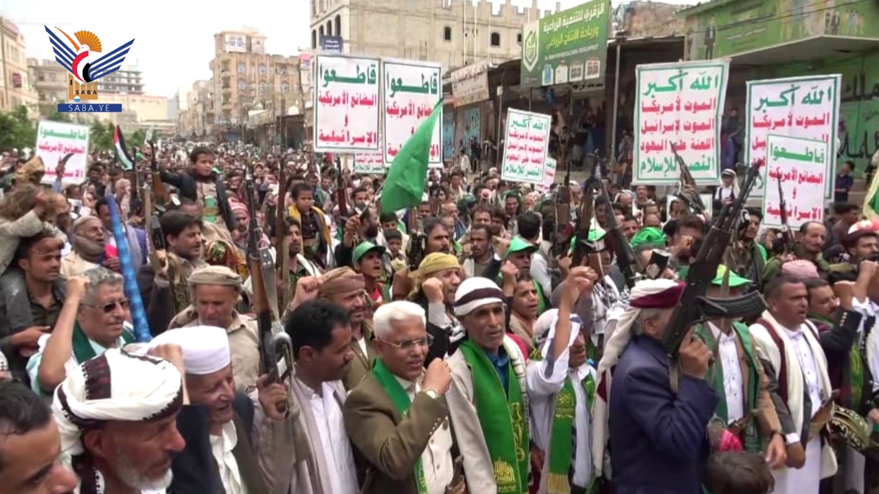 وجدد بيان صادر عن المسيرات العهد والوفاء لرسول الله صلى الله عليه وسلم في ذكرى مولده بأن الشعب اليمني لن يترك الجهاد ولن يترك غزة وفلسطين وسيظل إلى جانبهم حتى النصر.