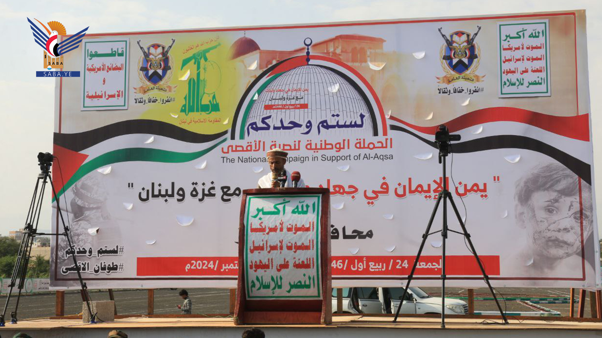 وأكد المشاركون أن اليمن مستمر في الوقوف إلى جانب المقاومة الفلسطينية واللبنانية، لمواجهة كيان العدو الصهيوني المدعوم أمريكياً وأروربياً، مشيرين إلى أن الطوفان اليمني مستمر ولا خيار إلا التمسك والوقوف إلى جانب القيادة الوطنية حتى استكمال عملية التحرير والتخلص من الهيمنة والوصاية الخارجية.