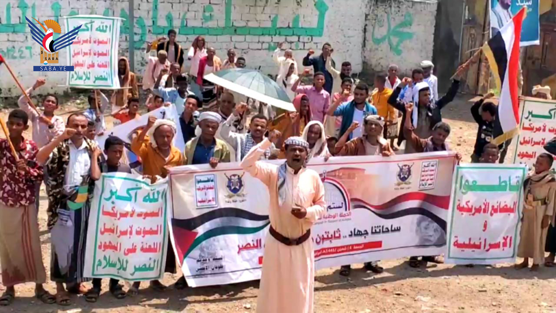 وفي المسيرات بمركز المحافظة بحضور أمين عام محلي المحافظة حسن العمري ووكيل المحافظة حافظ الواحدي وقيادات محلية وأمنية بالمديريات، رفع المشاركون، العلمين اليمني والفلسطيني ولافتات معبرة عن مناصرة ودعم الشعب اليمني للشعبين الفلسطيني واللبناني، والإعلان عن الجهوزية لخوض معركة "الفتح الموعود والجهاد المقدس".