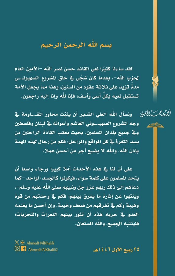 وقال الشيخ الخليلي في بيان له نشره على صفحته بمنصة (إكس) اليوم: "ساءنا كثيرًا نعي الأمين العام لحزب الله، بعدما كان شجًى في حلق المشروع الصهيوني مدةً تزيد على ثلاثة عقود؛ فإنا لله وإنا إليه راجعون.